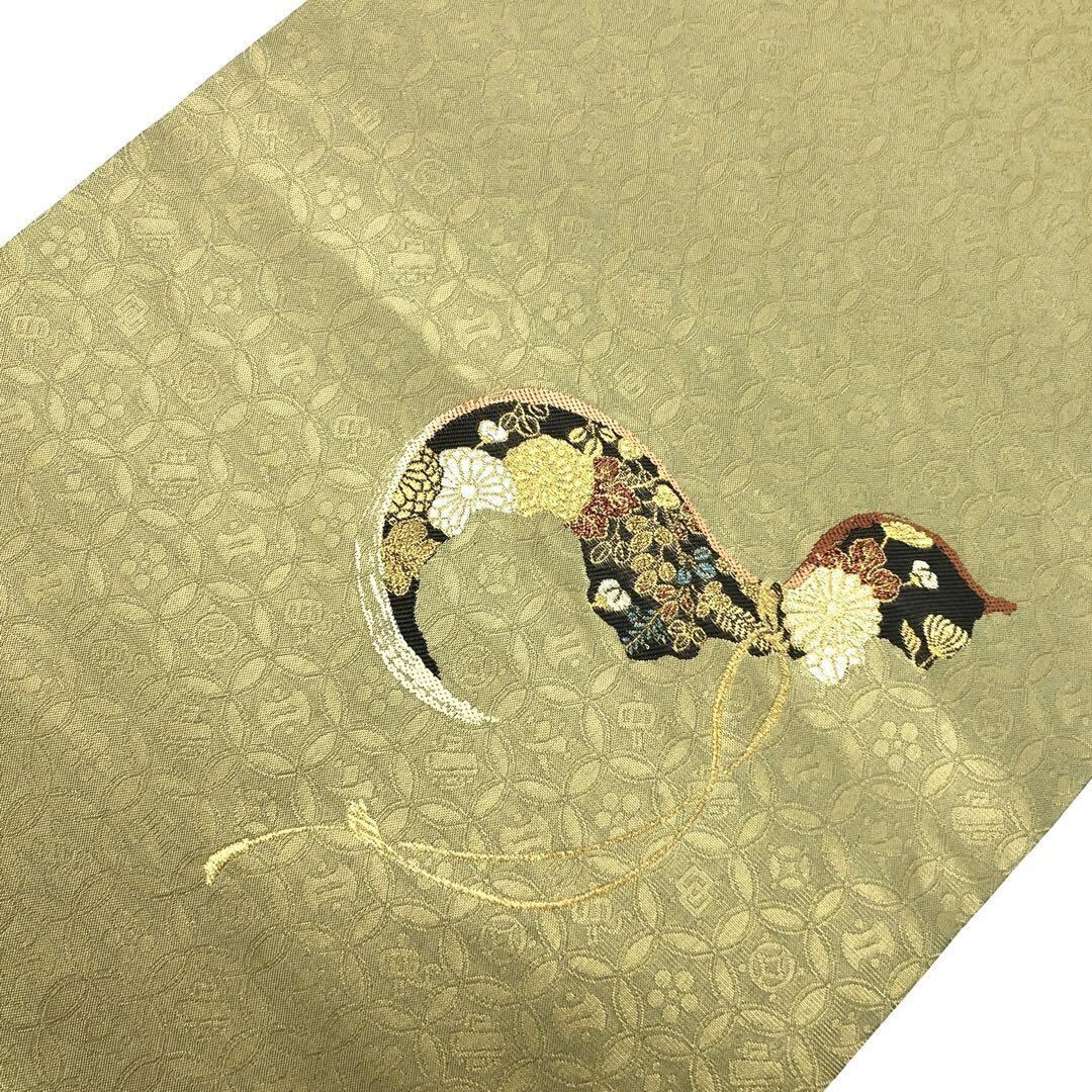 名古屋帯 瓢箪に花模様 金糸 利休色 しつけ糸 O-4614 着物 きもの kimono 和服 和装 中古 リサイクル着物 【送料無料】