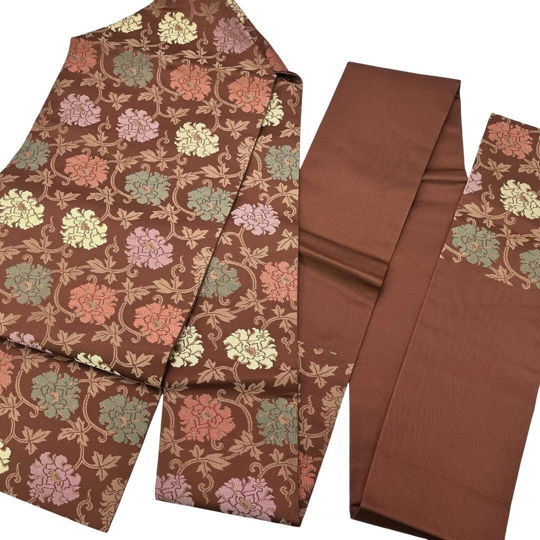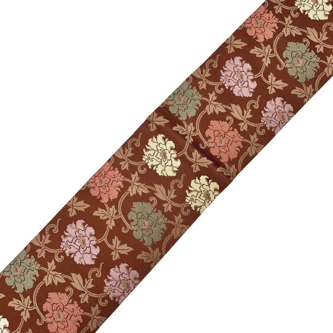 名古屋帯 色鮮やかな花唐草模様 栗梅色 O-4603 着物 きもの kimono 和服 和装 中古 リサイクル着物 【送料無料】