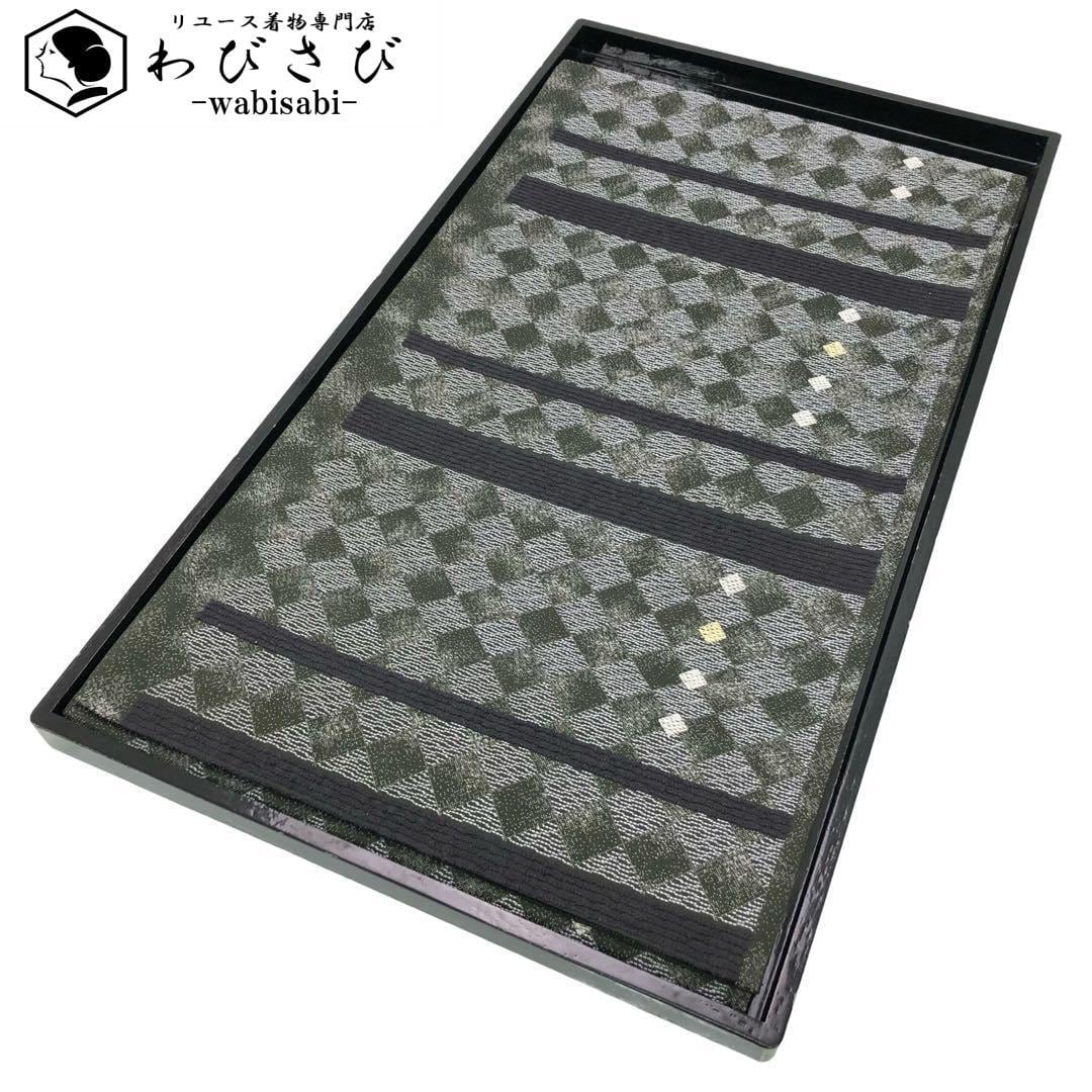 藍海松茶色ベースのお色味にモダンな菱形模様がデザインされた素敵な柄裄のお品でございます。
