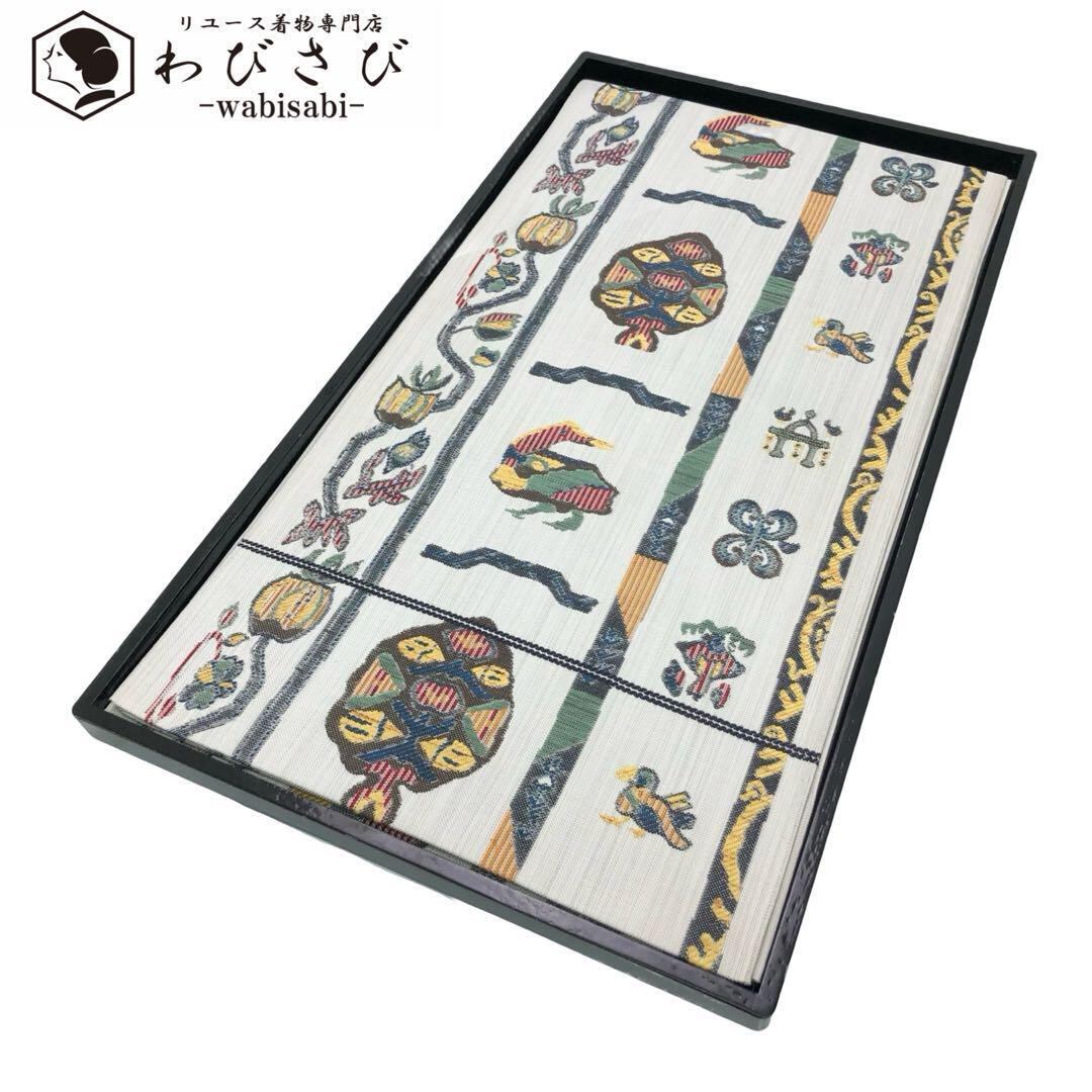雲井鼠色のお色味に鳥、花、木などの多様な抽象柄がデザインされた素敵なお品でございます。