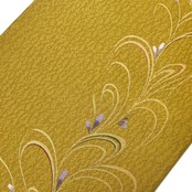 黄橡色の落ち着きのある黄色味のお色、上品な花草模様の柄裄がデザインされた素敵なお品でございます。