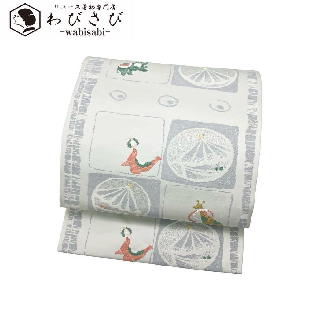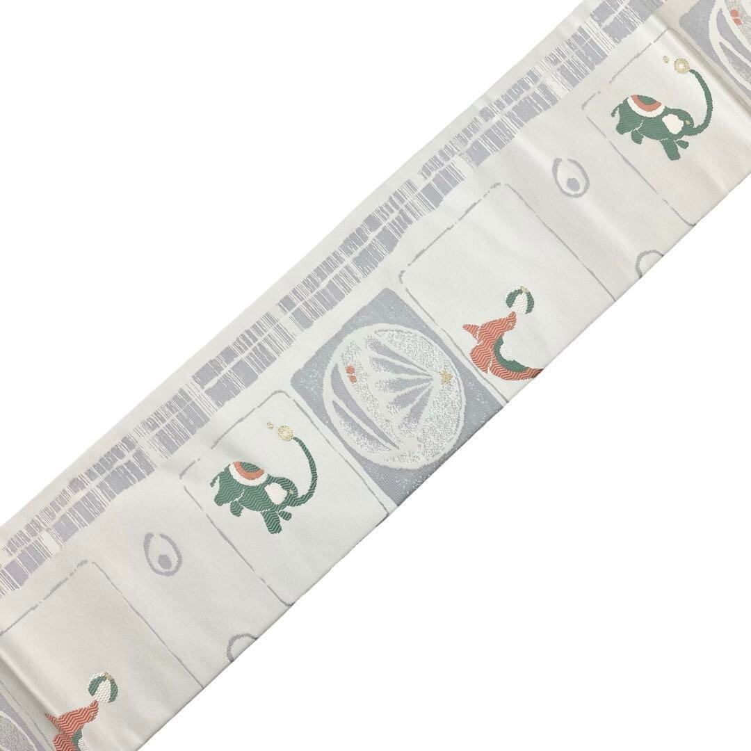 名古屋帯 サーカス柄 動物 キリン ゾウ アシカ テント 白色 O-4612 着物 きもの kimono 和服 和装 中古 リサイクル着物 【送料無料】