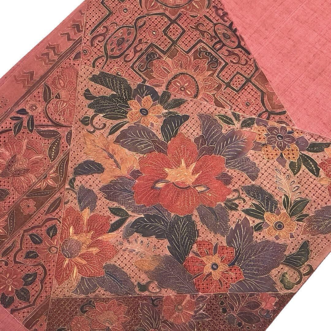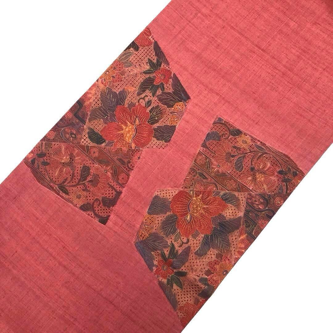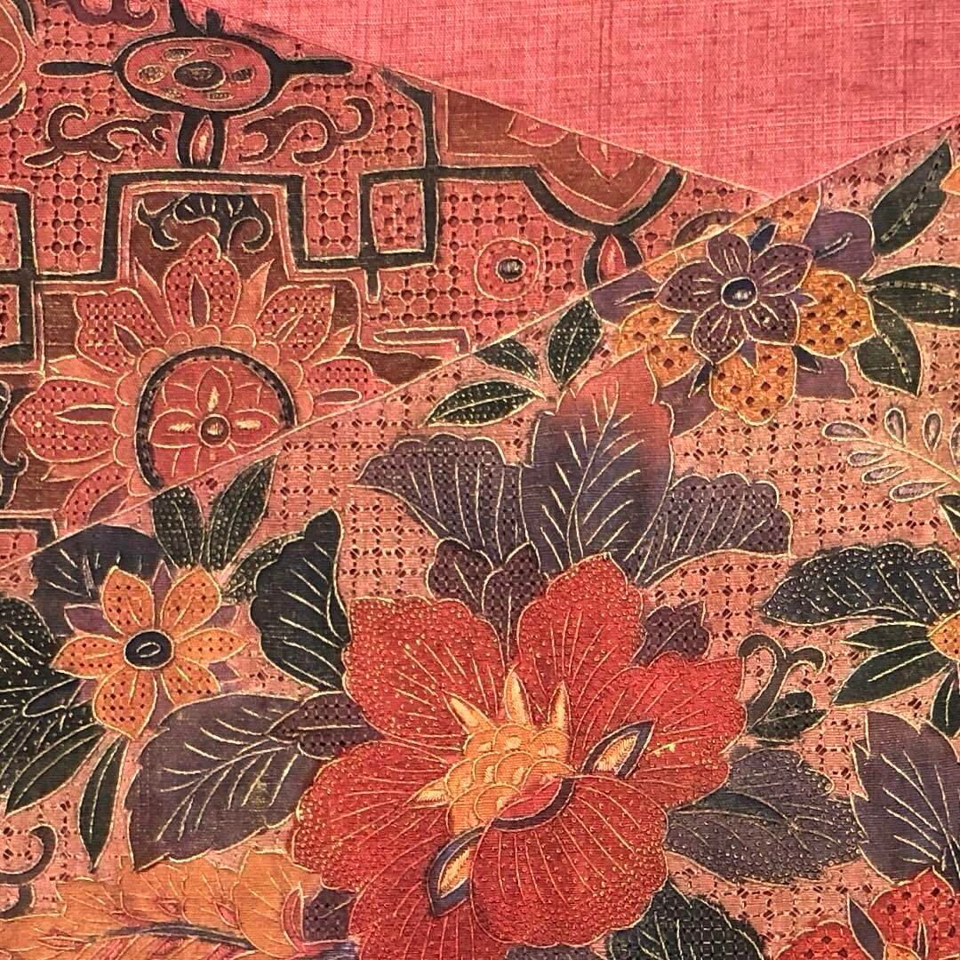 蘇芳色のお色味の紬地に相良刺繍や汕頭刺繍などの中国刺繍で美しい花柄模様がデザインされた素敵なお品でございます。