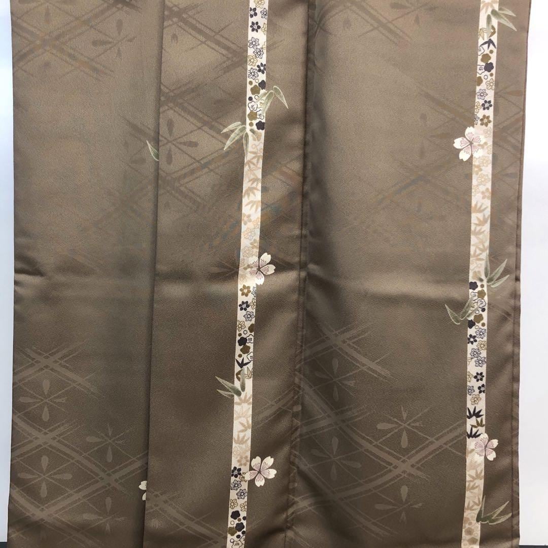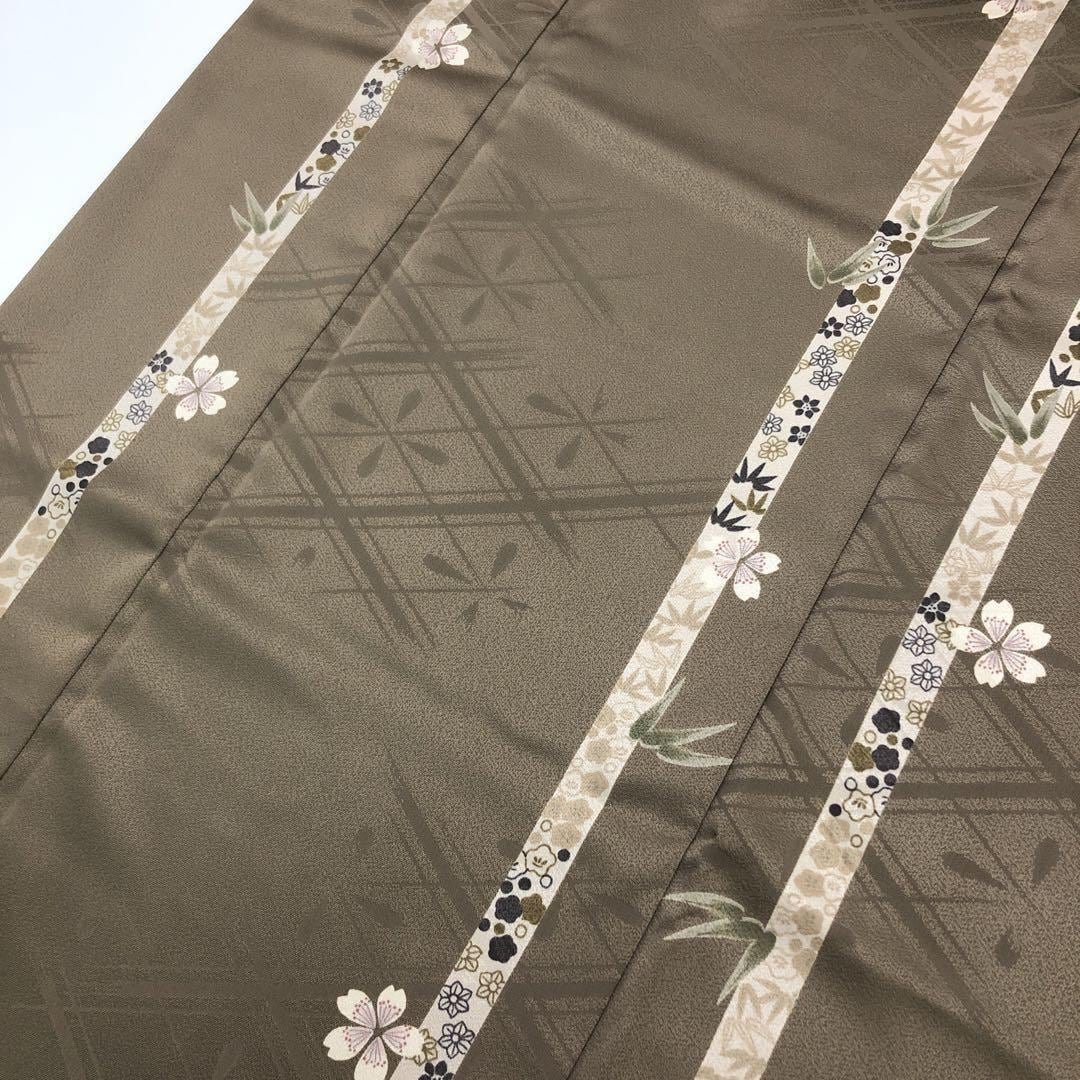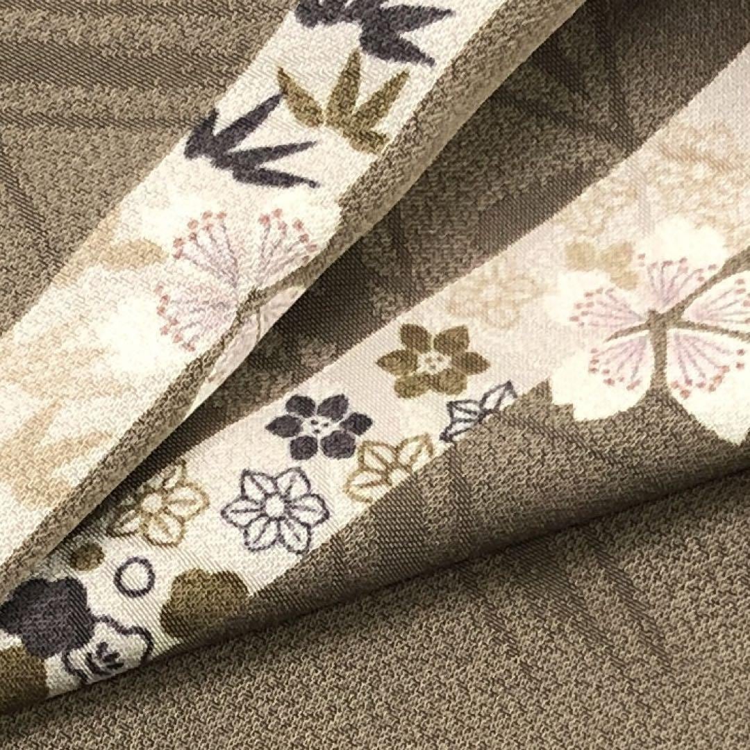 生壁色の落ち着いたお色味に花菱の地模様に縦柄の花模様がデザインされた素敵なお品でございます。