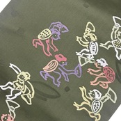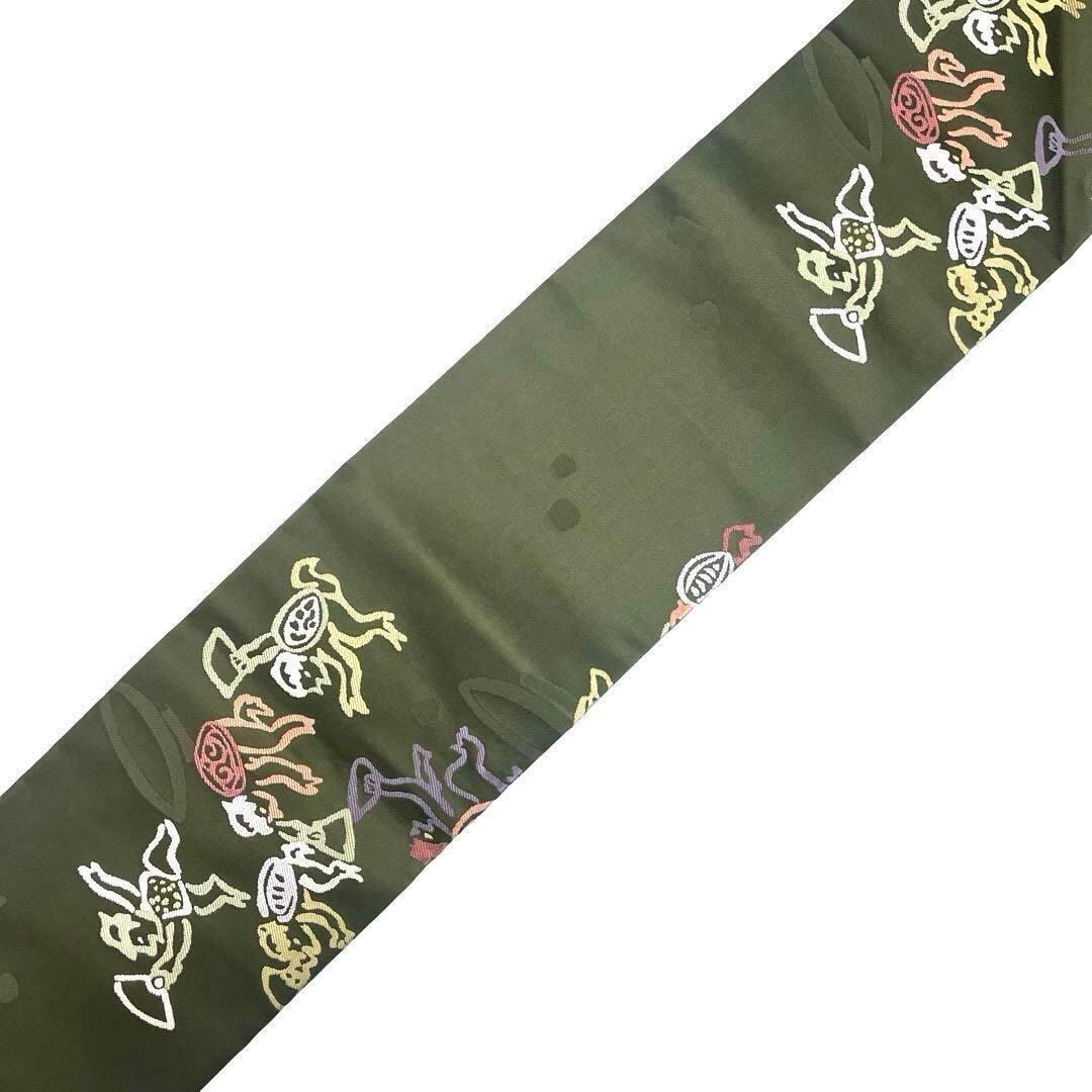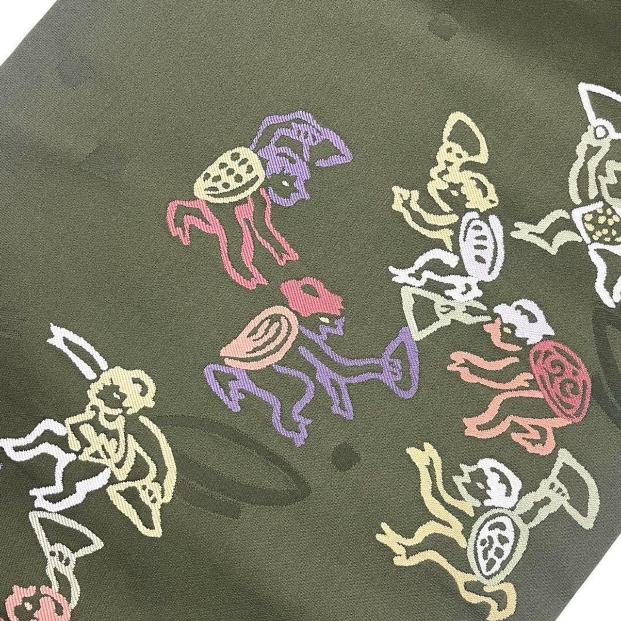 海松色の落ち着いた緑味のお色に多様な色彩の楽しげな河童達の柄裄がデザインされた珍しい素敵なお品でございます。