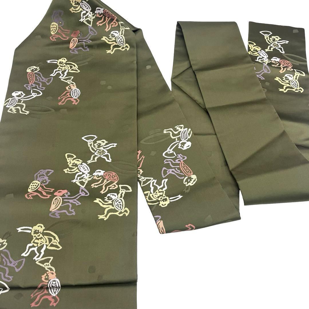 名古屋帯 想像の世界 多様な色彩の河童柄 海松色 珍柄 O-4636 着物 きもの kimono 和服 和装 中古 リサイクル着物 【送料無料】