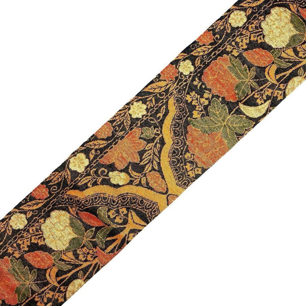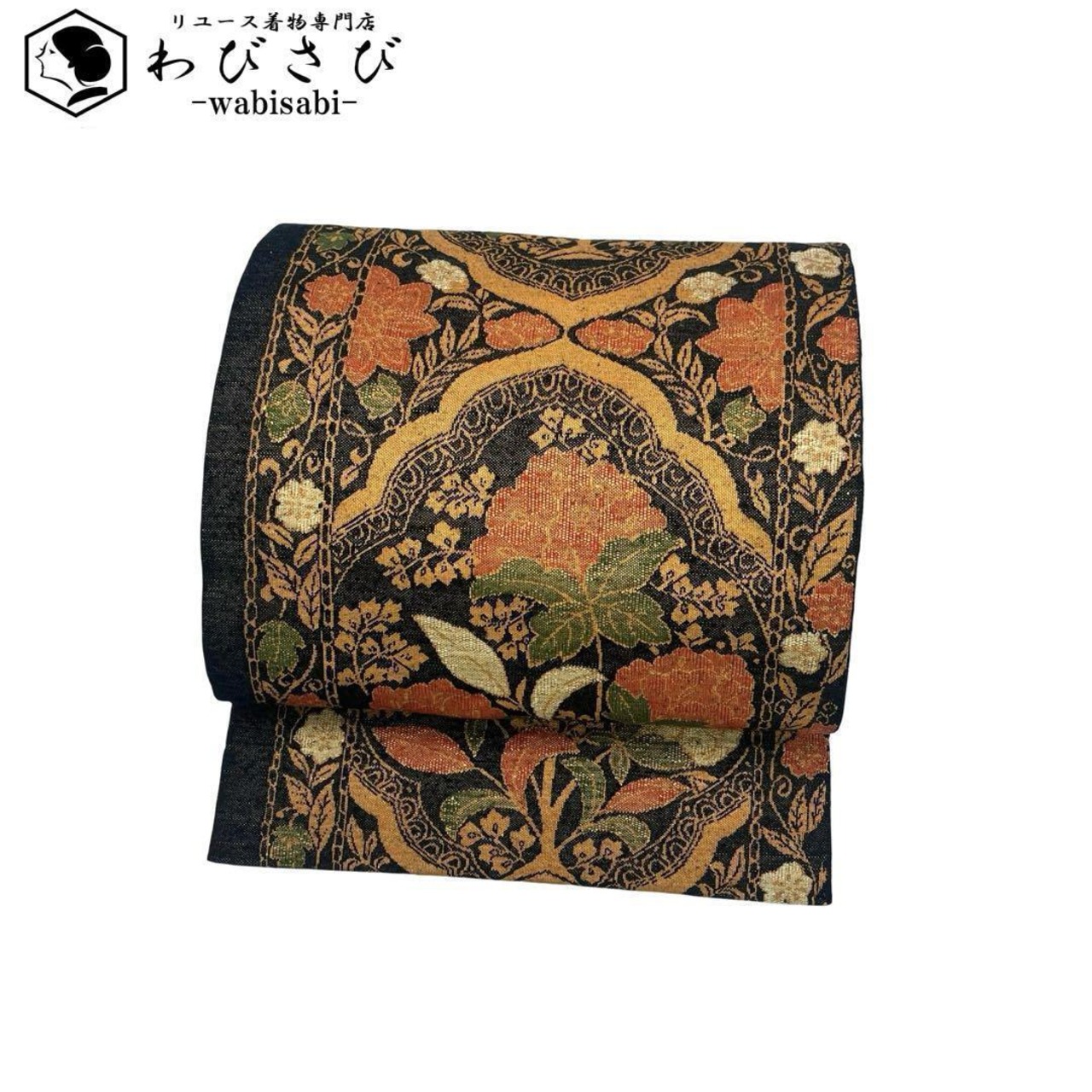 名古屋帯 真綿紬 美しい花柄織模様 黒色 O-4633 着物 きもの kimono 和服 和装 中古 リサイクル着物 【送料無料】