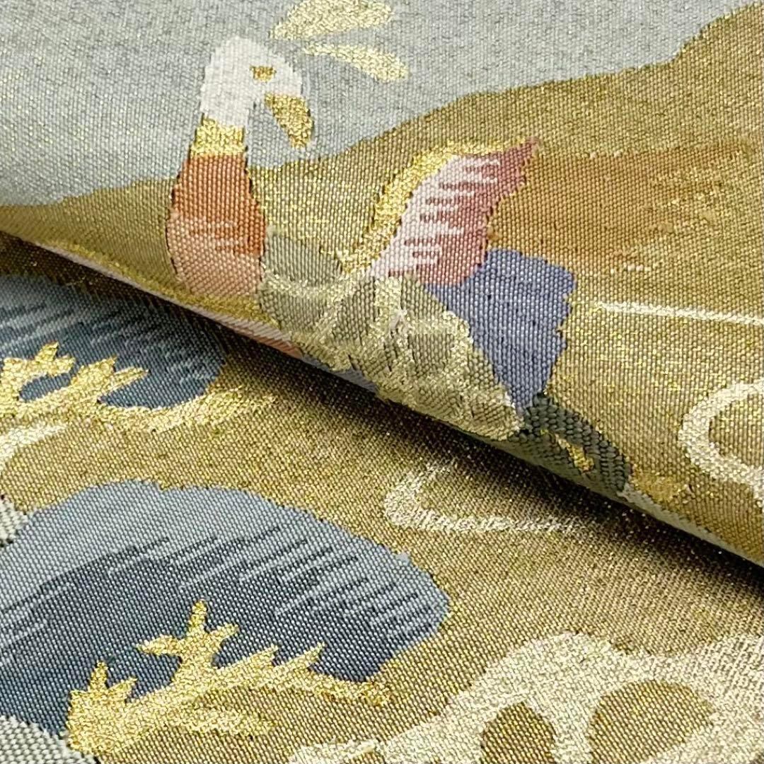 生成色の品のあるお色味に風景柄、鳥、流水、花模様などの柄裄がデザインされた素敵なお品でございます。