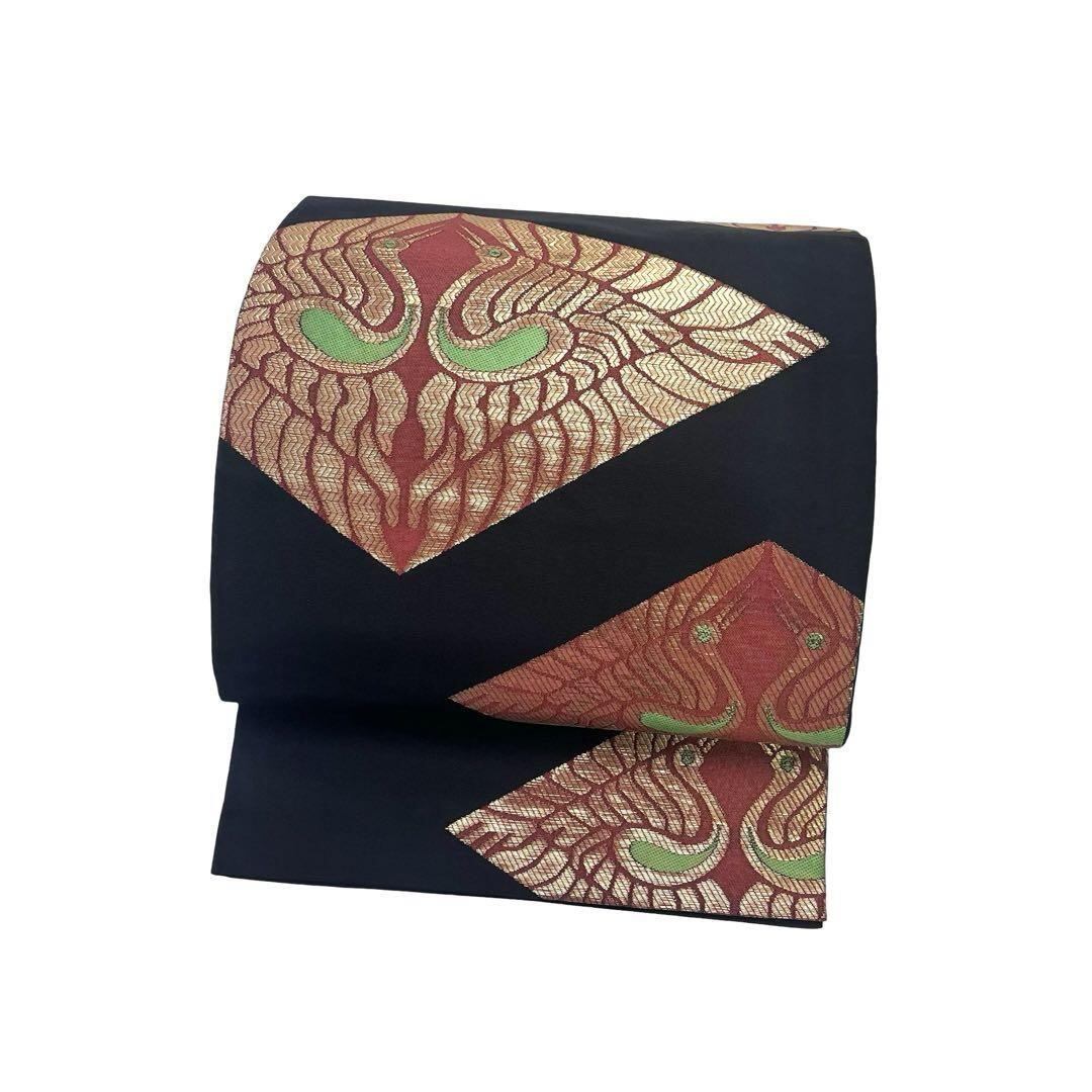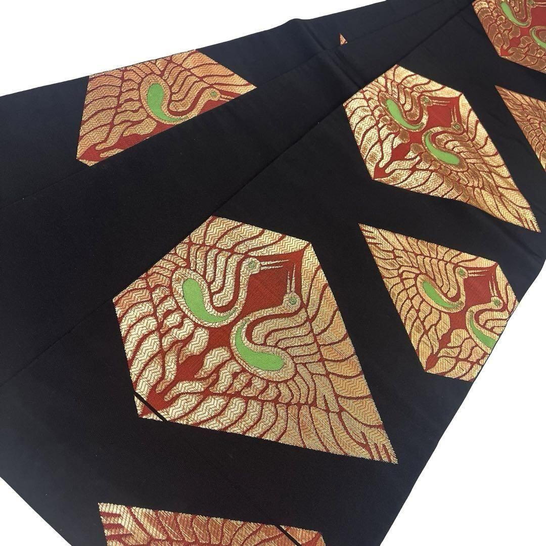 袋帯 西陣 桝屋高尾 菱形に向い鳥 金糸 黒色 O-4630 着物 きもの kimono 和服 和装 中古 リサイクル着物 【送料無料】