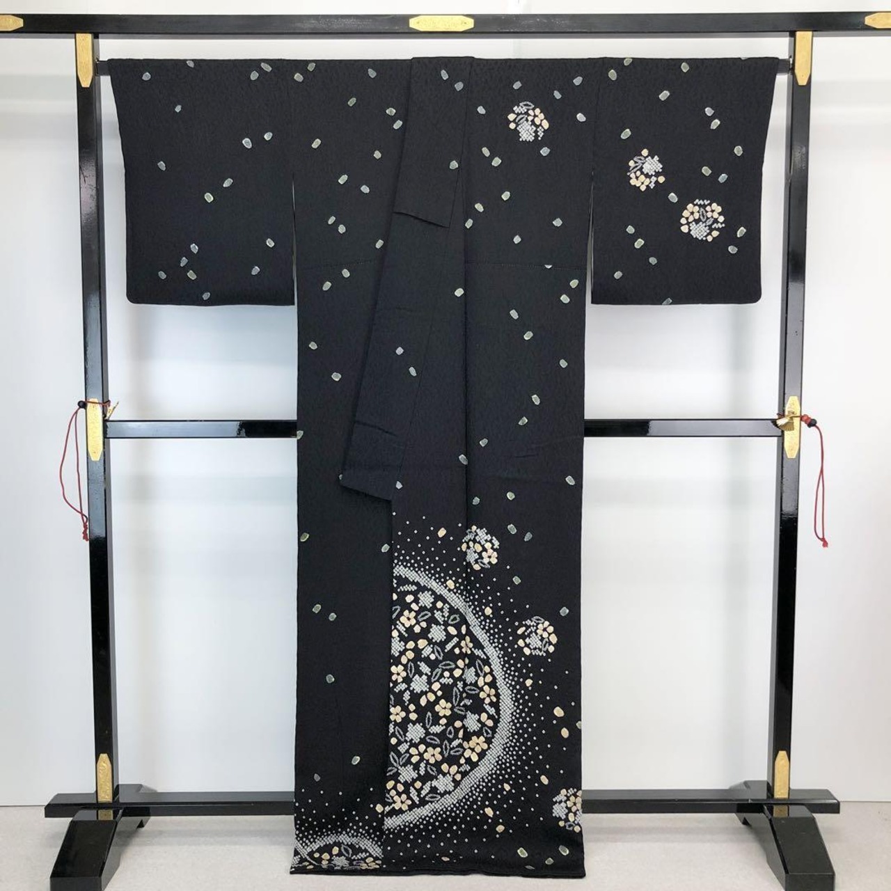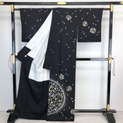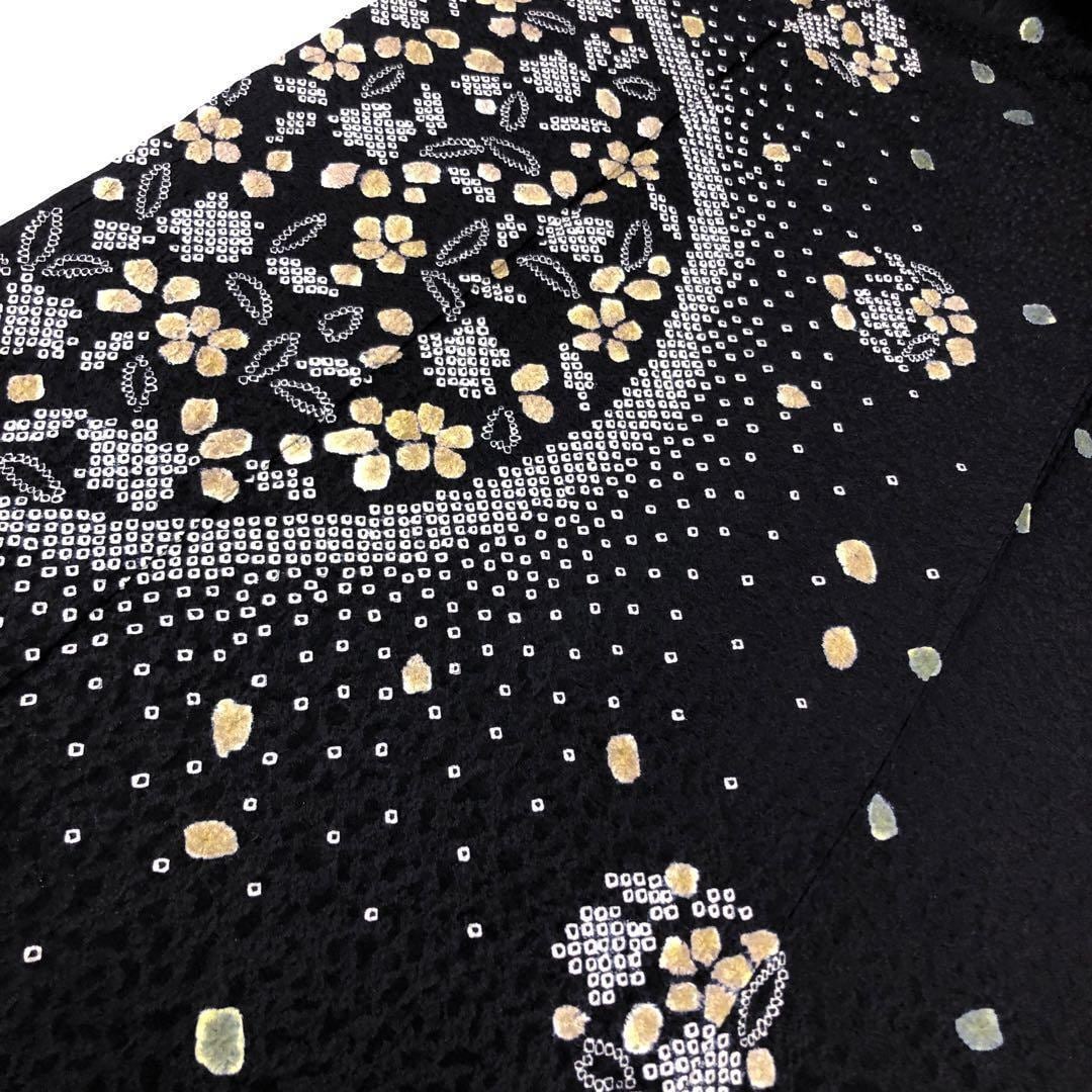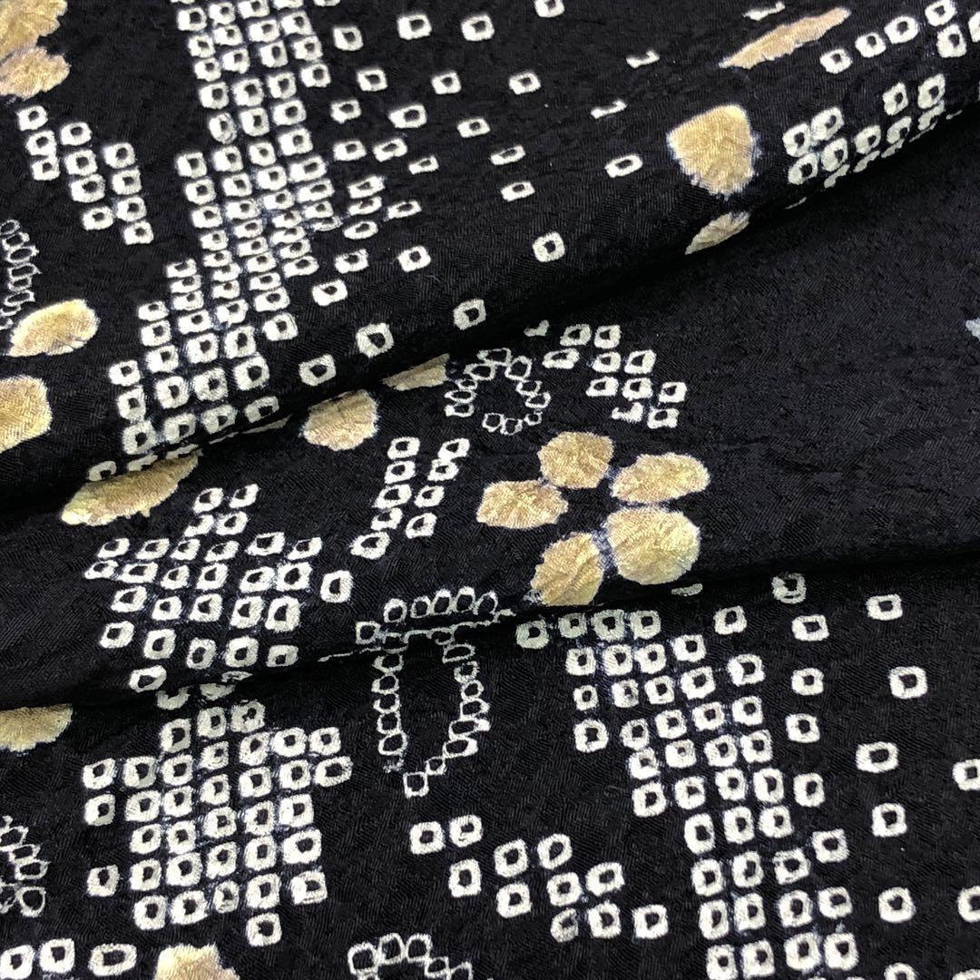 黒色ベースのお色味に絞り柄の丸の中に花模様がデザインされた素敵な柄裄のお品でございます。