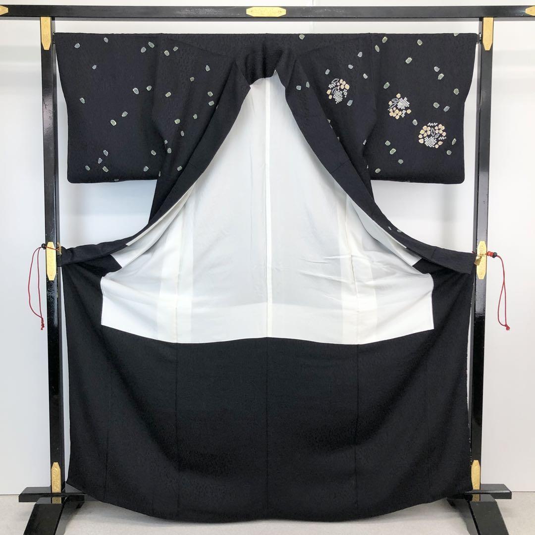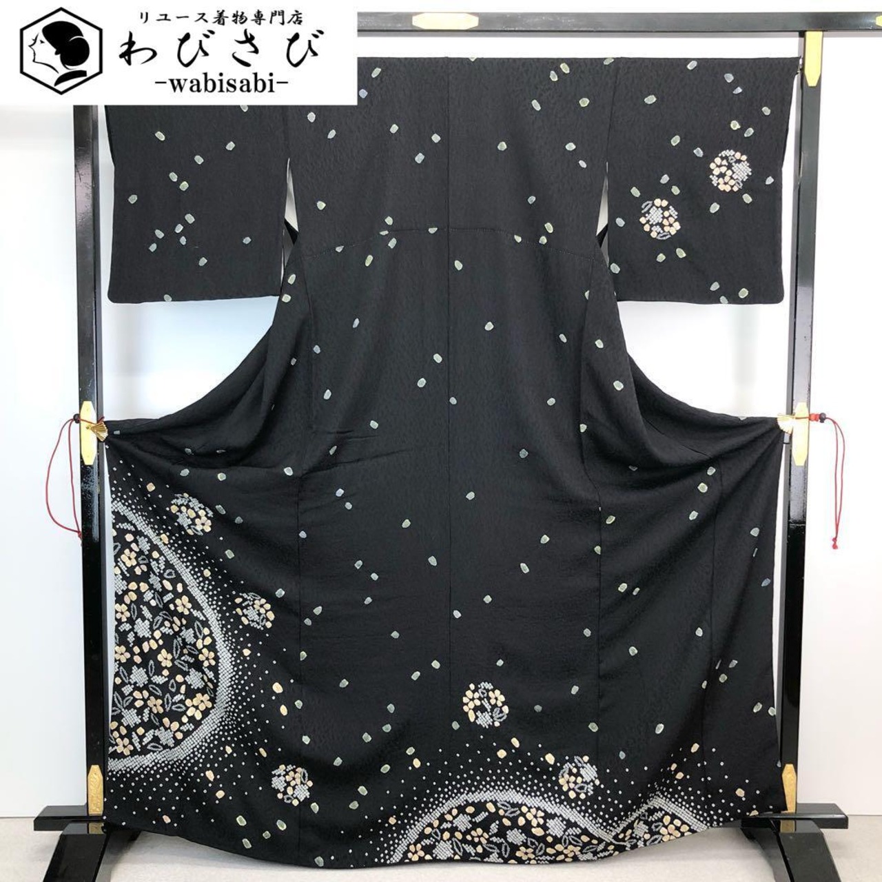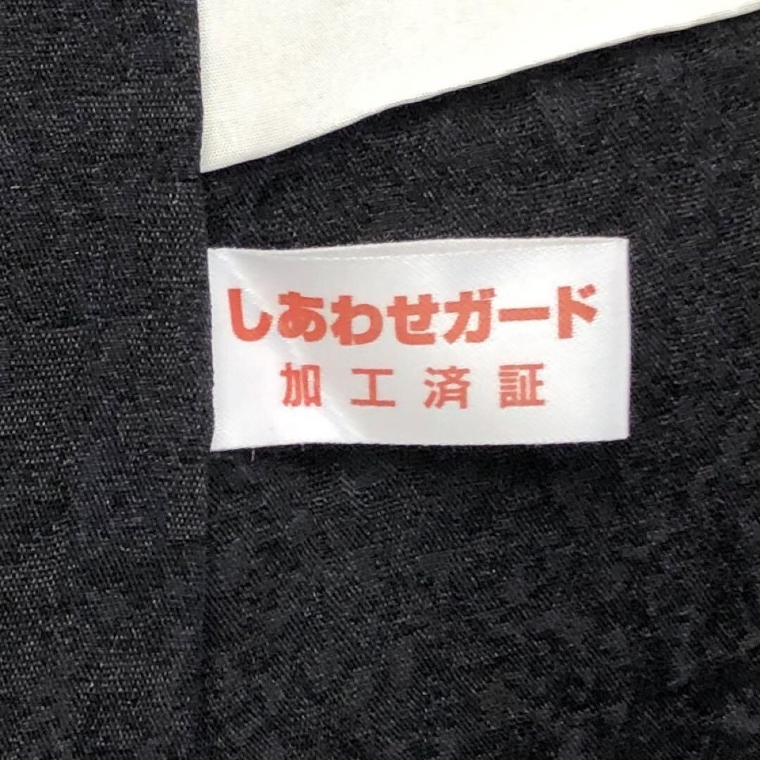 黒色ベースのお色味に絞り柄の丸の中に花模様がデザインされた素敵な柄裄のお品でございます。