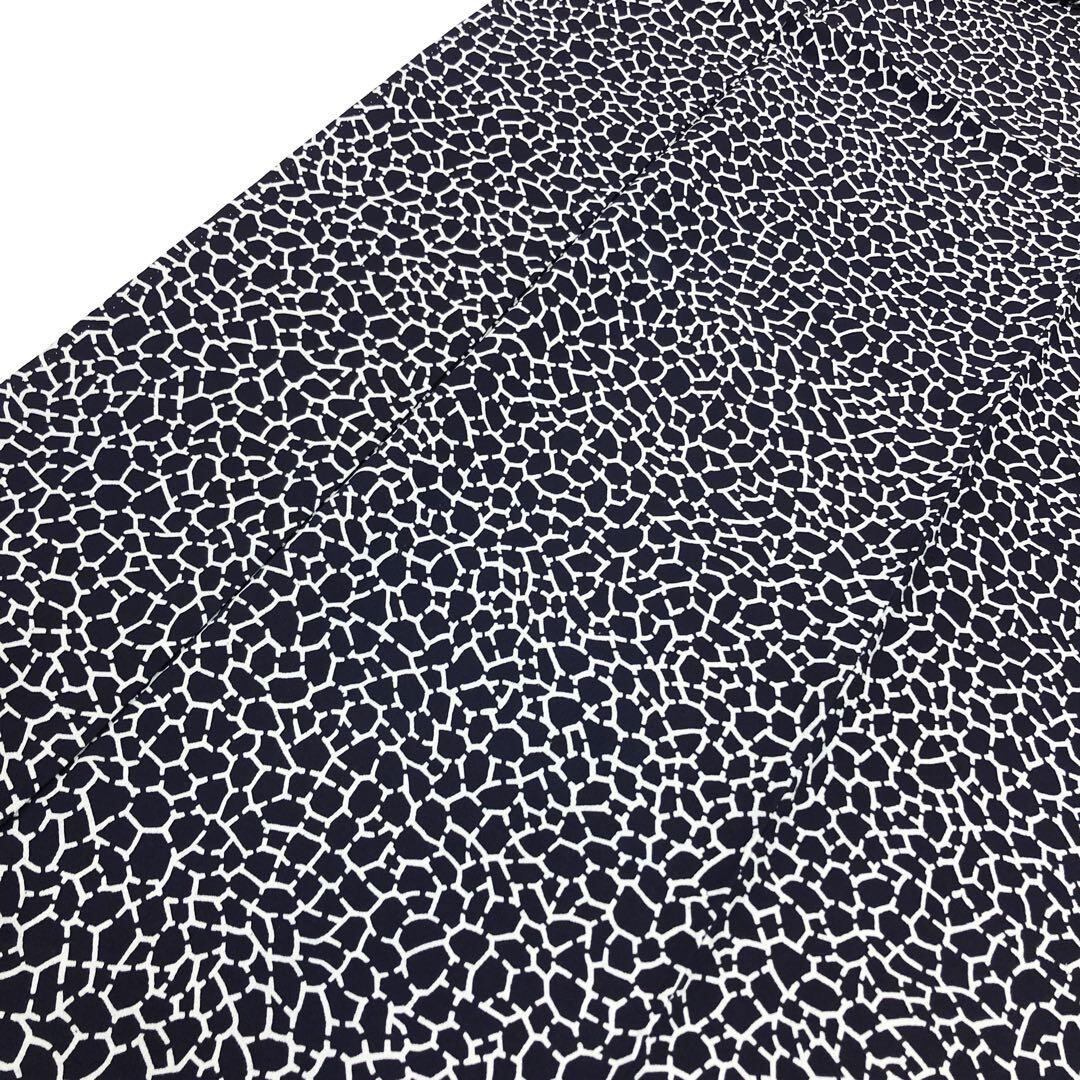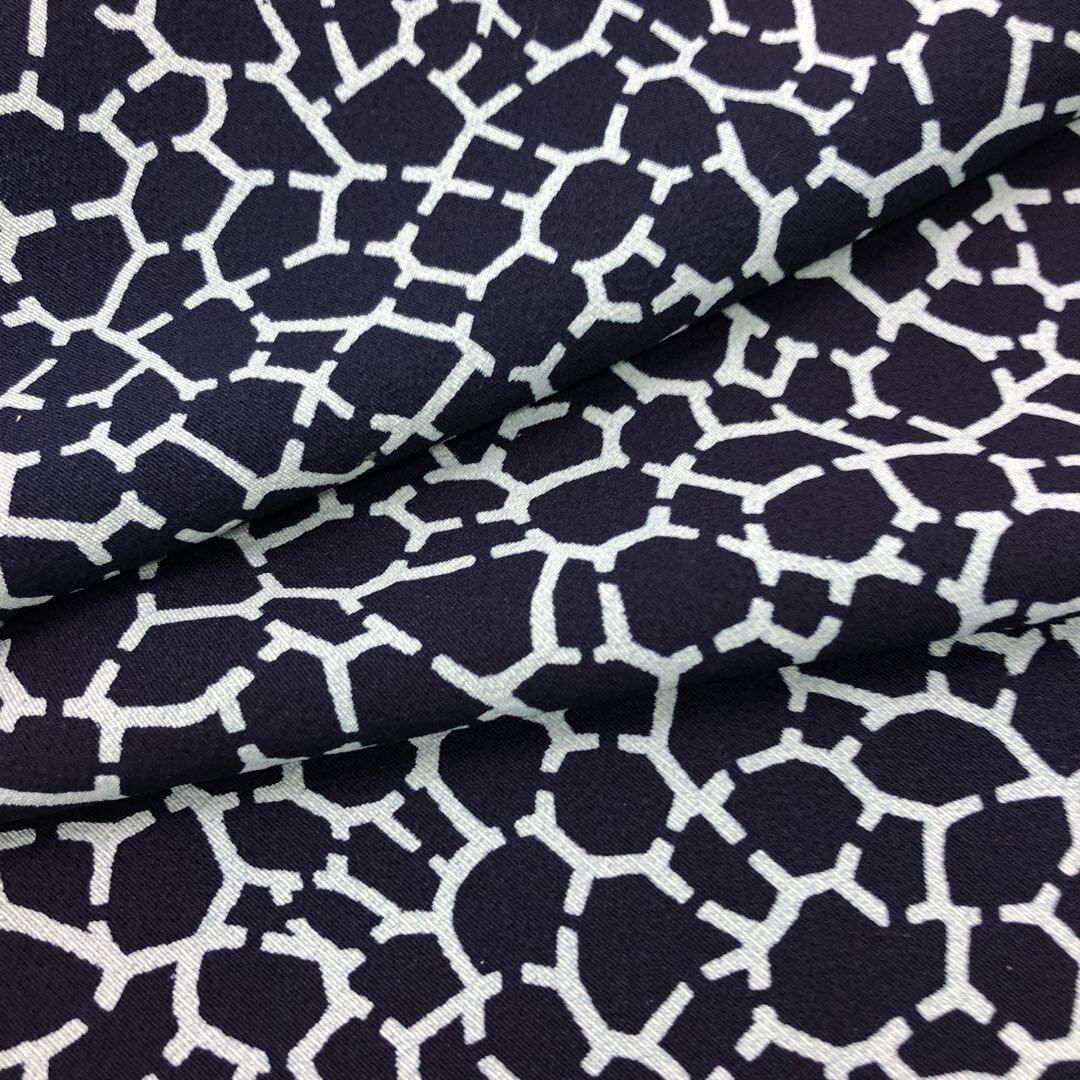 藍染の雰囲気の良いお色味の縮緬地に石垣のような染模様がデザインされた素敵なお品でございます。
