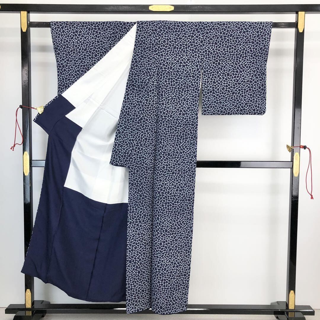 小紋 藍染 石垣のような染模様 藍色 縮緬 K-4347 着物 きもの kimono 和服 和装 中古 リサイクル着物 【送料無料】