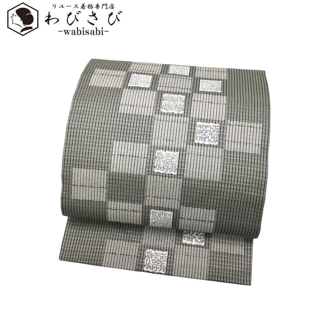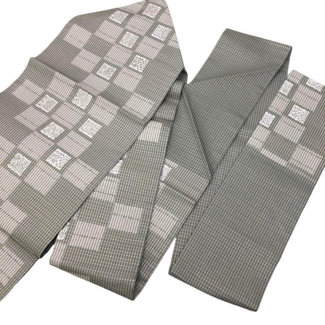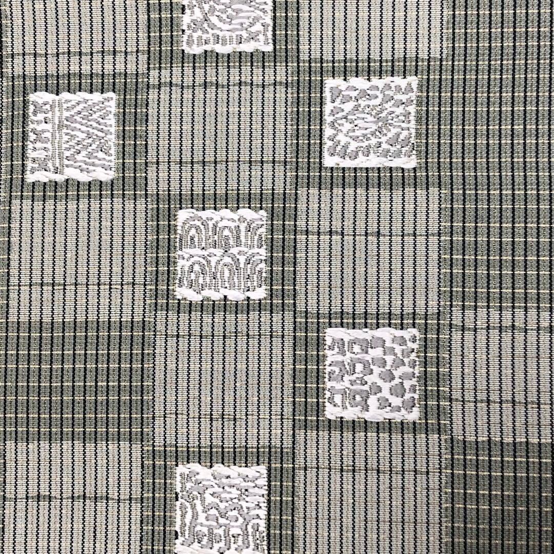 灰緑色のお色味に格子柄、四角の中に抽象織模様がデザインされた素敵な雰囲気の良い素敵なお品でございます。