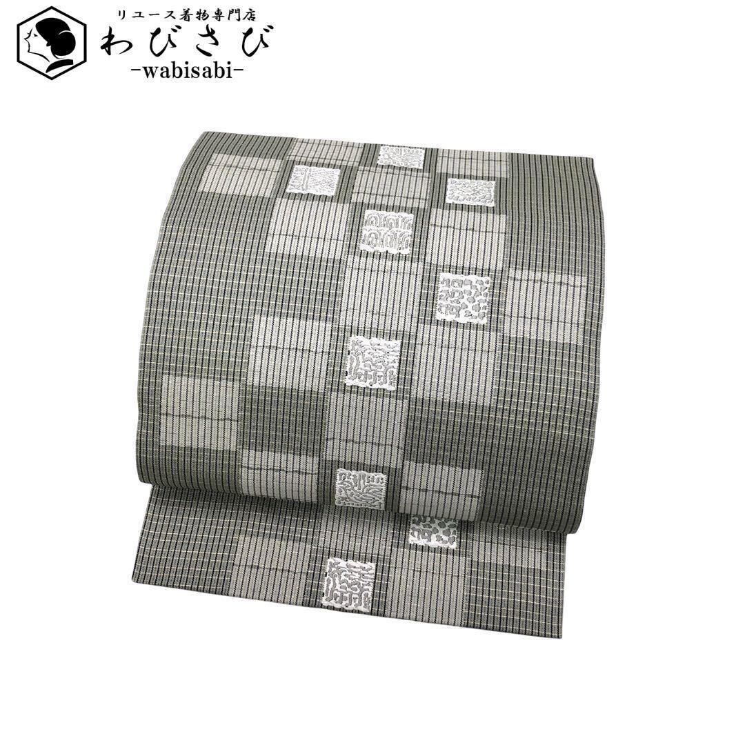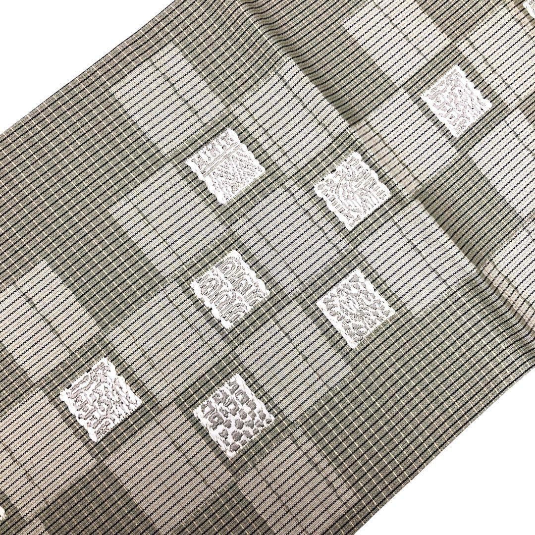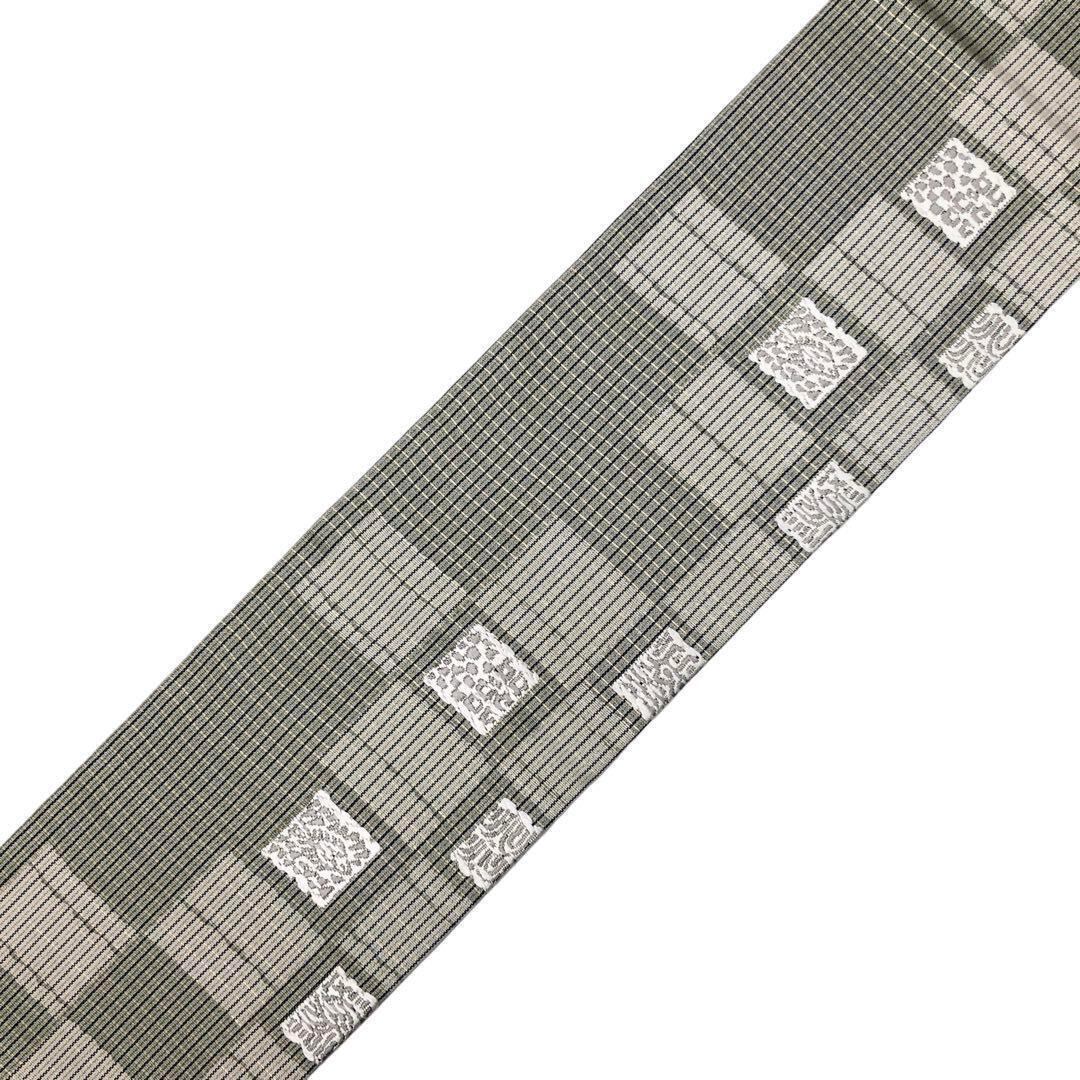 灰緑色のお色味に格子柄、四角の中に抽象織模様がデザインされた素敵な雰囲気の良い素敵なお品でございます。