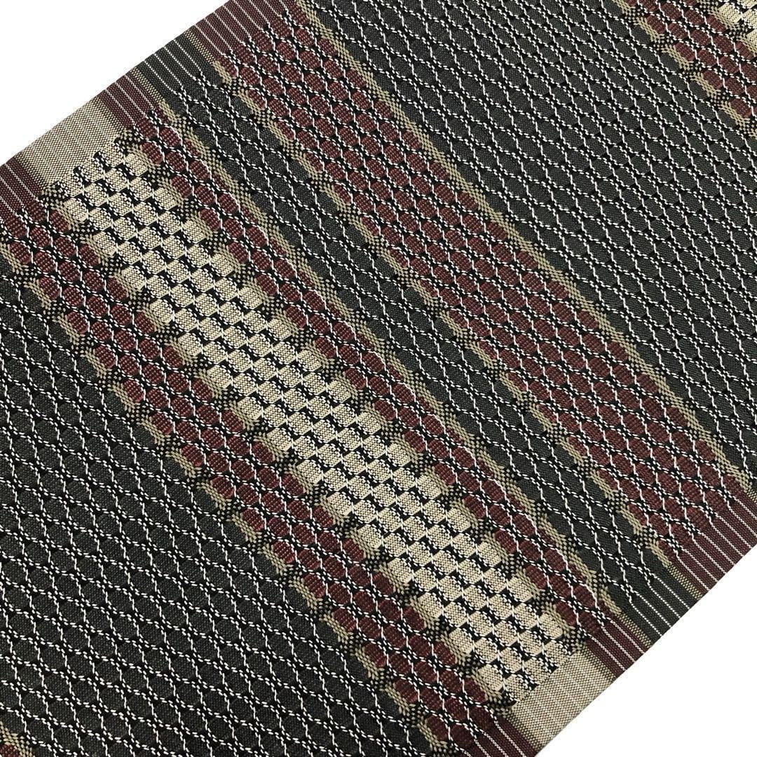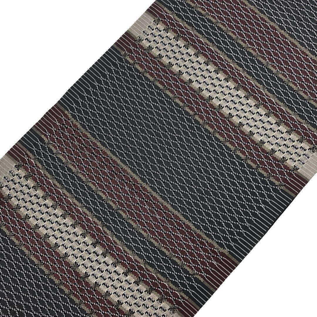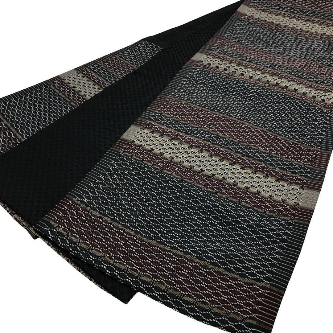 具墨色ベースの落ち着きのある色彩、横縞柄に横段織模様がデザインされた素敵な柄裄のお品でございます。