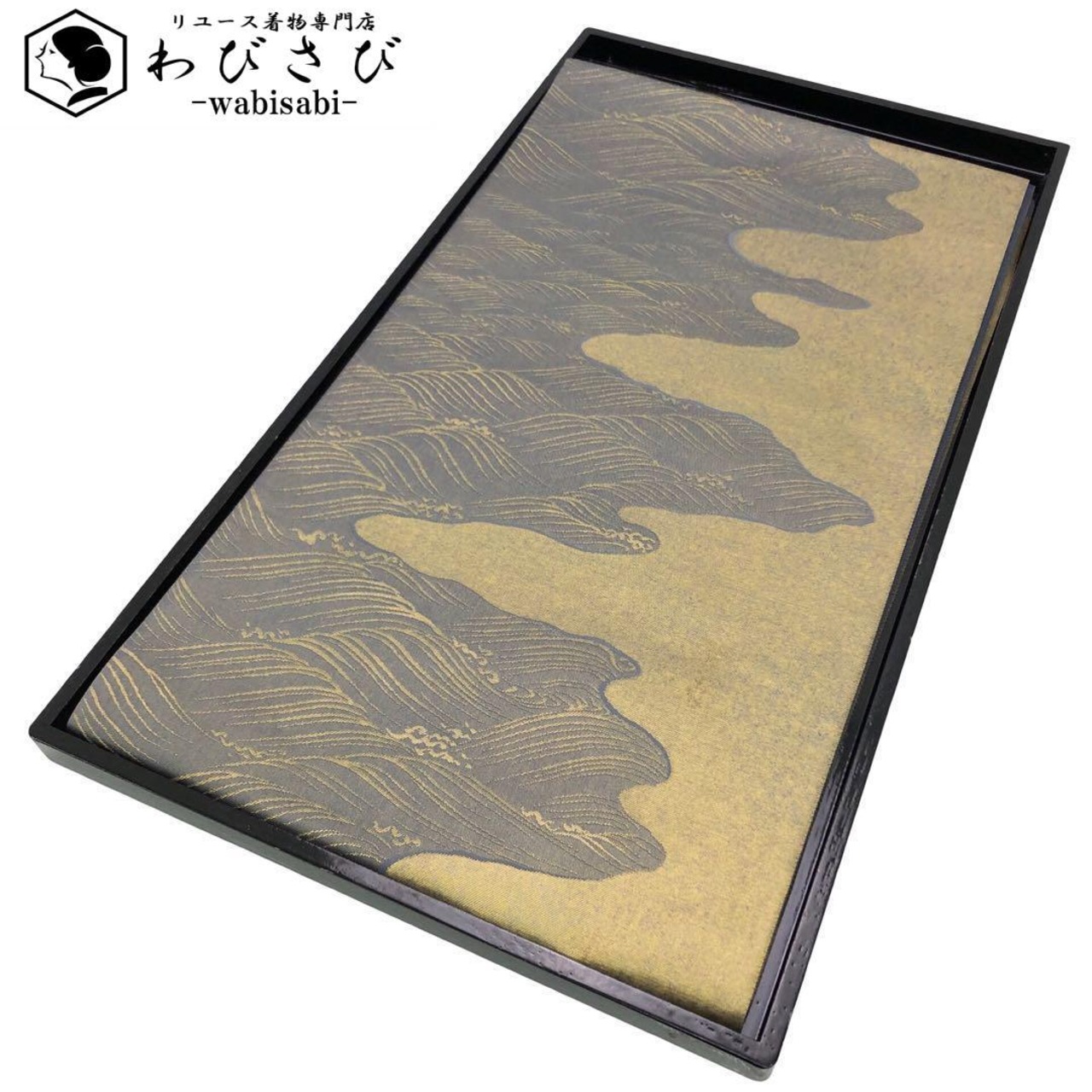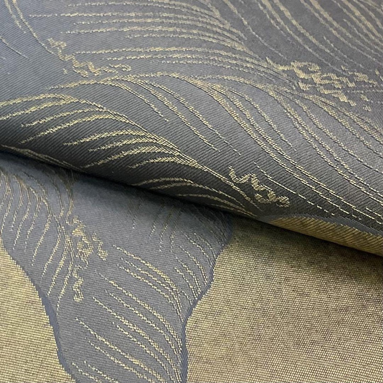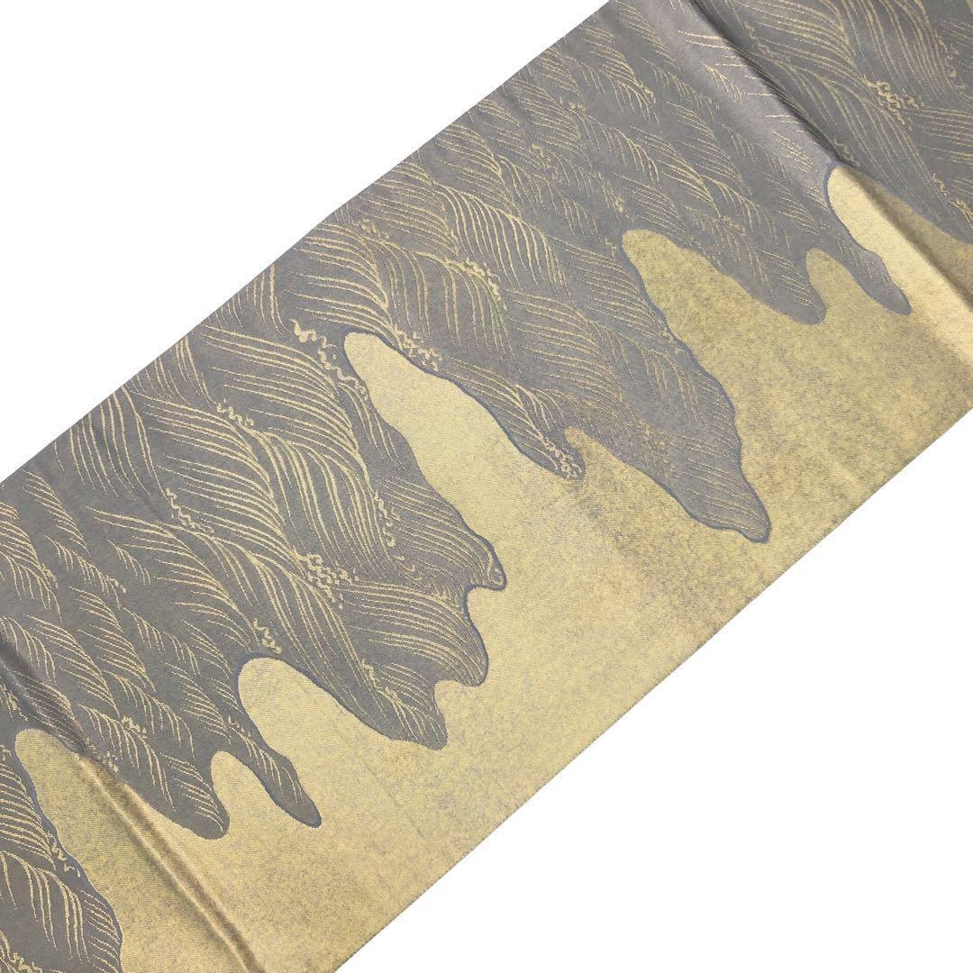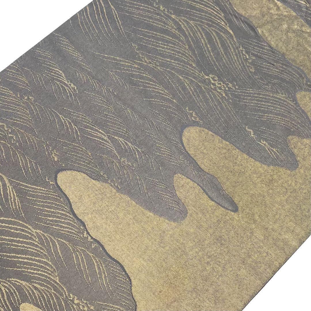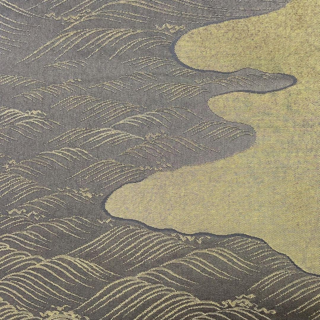 鳩羽鼠色の落ち着いたお色味に金糸の波模様、霞模様の柄裄がデザインされた雰囲気の良い素敵なお品でございます。