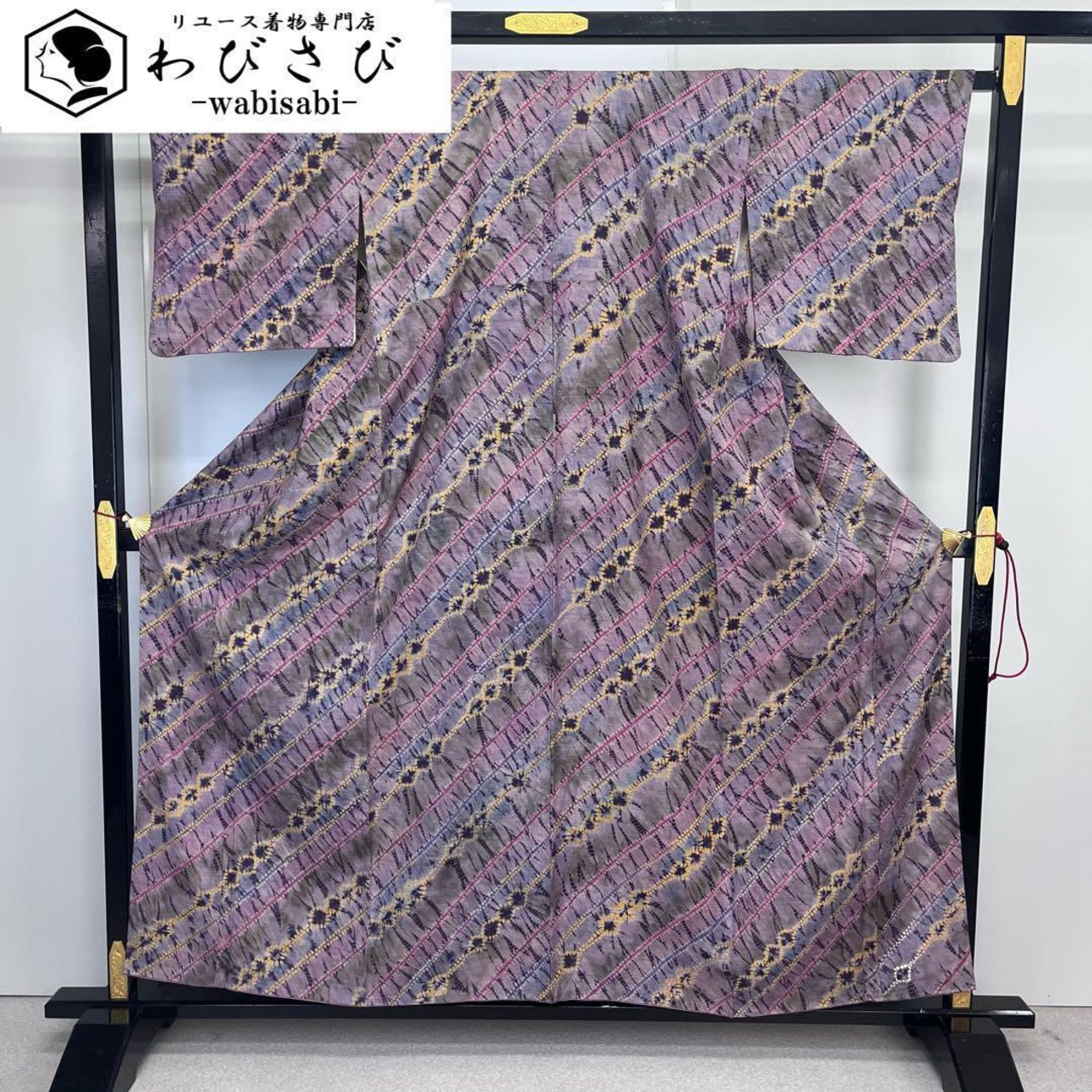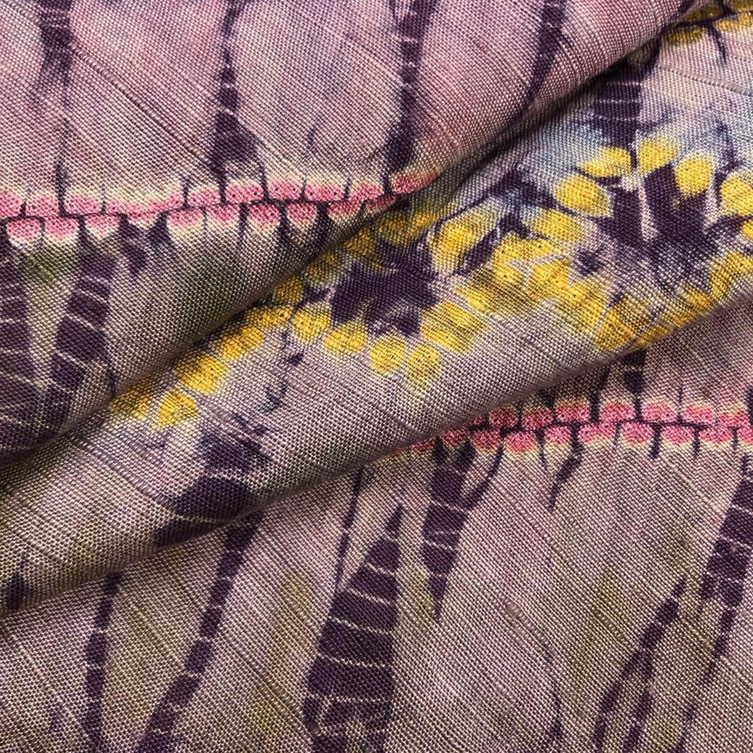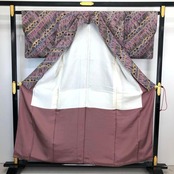 薄京紫色ベースのお色味の染柄、雰囲気の良い絞りの柄裄がデザインされた素敵なお品でございます。