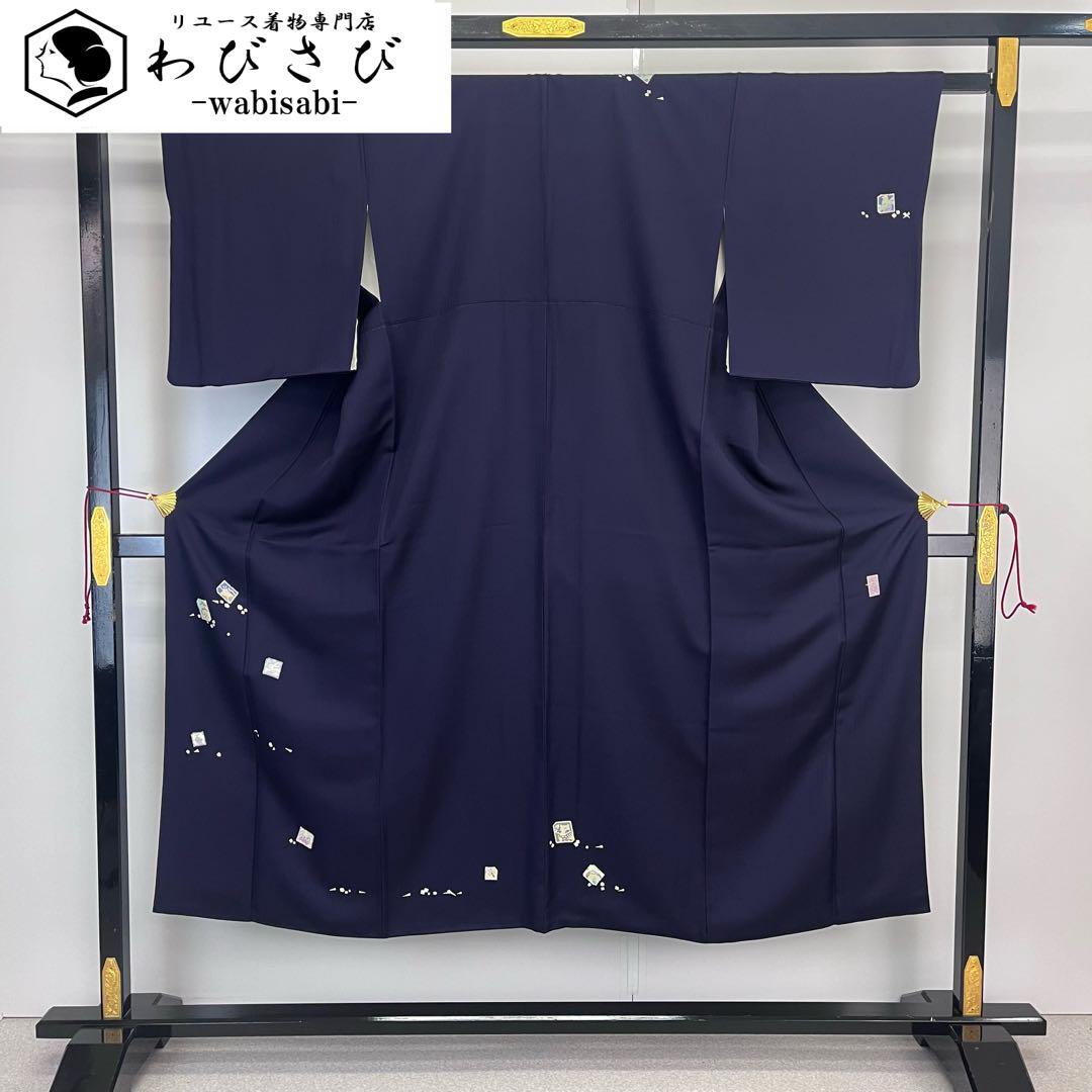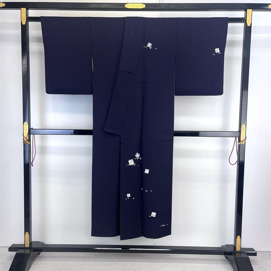紺青色の雰囲気の良いお色味に四角の中に抽象柄の木菟、兎などの柄裄がデザインされた素敵なお品でございます。