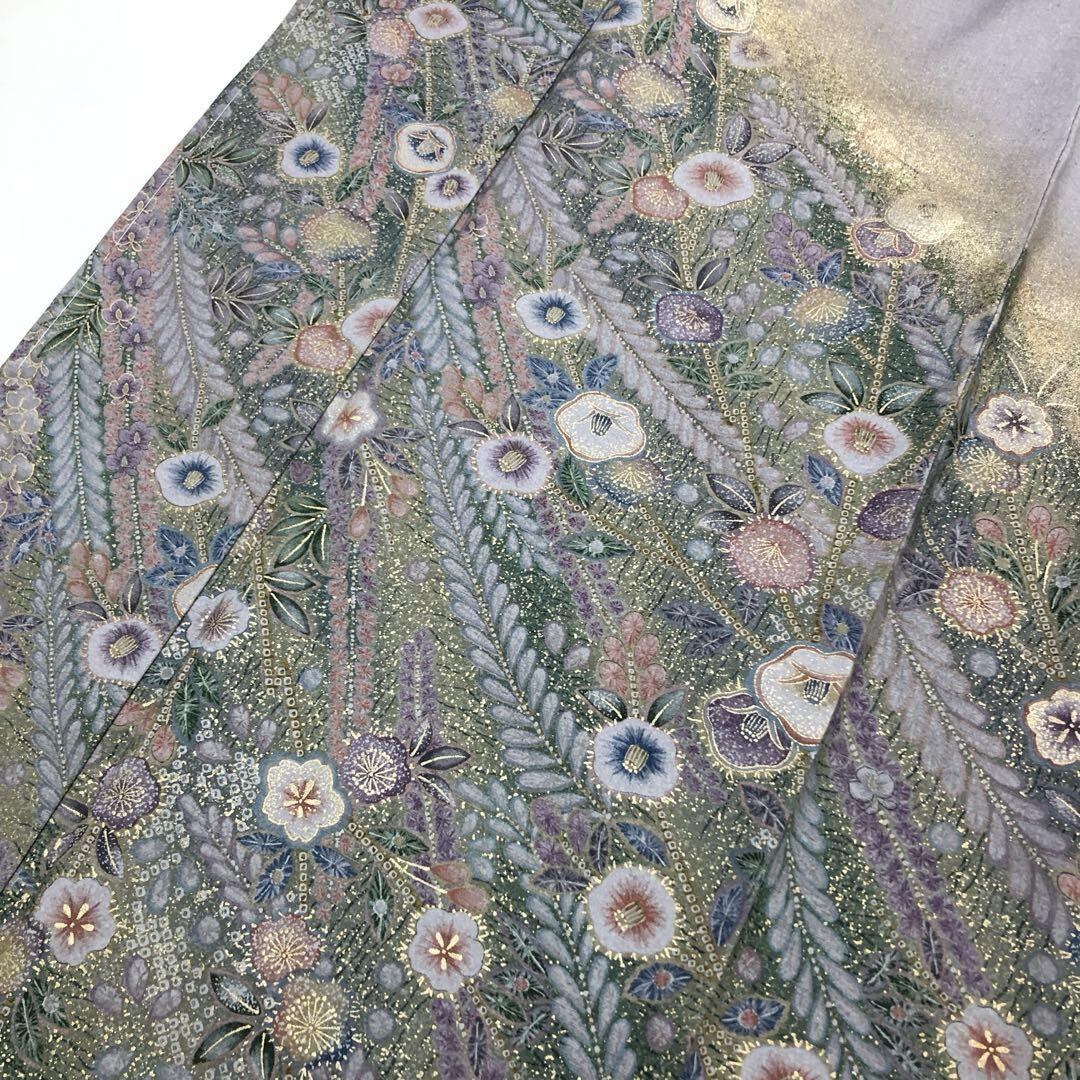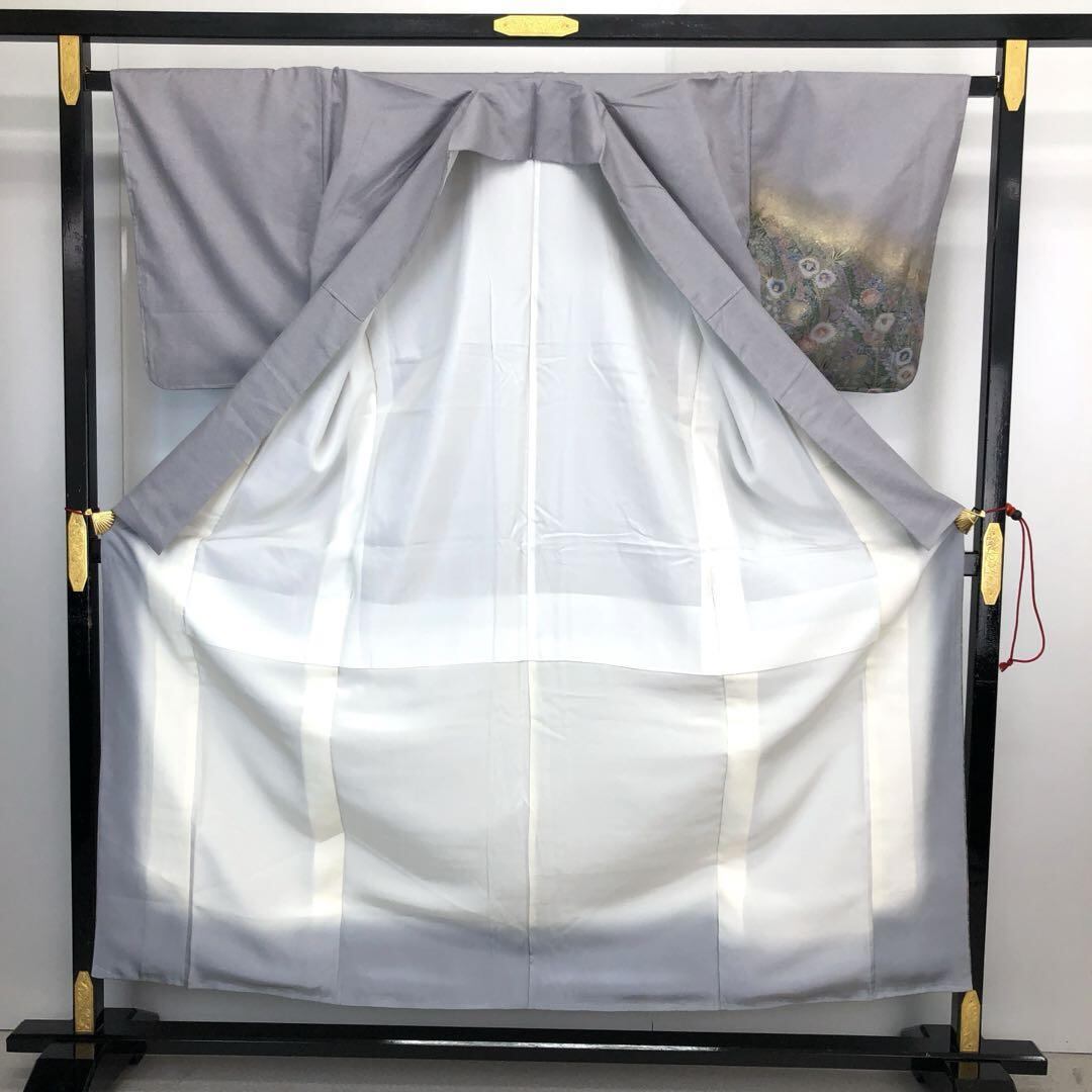 付下げ 美しい花柄模様 金彩 鳩羽色 紬 しつけ糸 K-4352 着物 きもの kimono 和服 和装 中古 リサイクル着物 【送料無料】