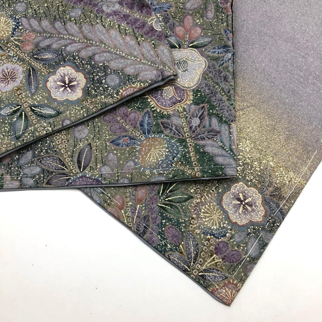 鳩羽色の落ち着いたお色味の紬地に金彩が使われた美しい花柄模様がデザインされた素敵な柄裄のお品でございます。