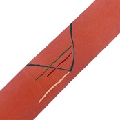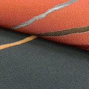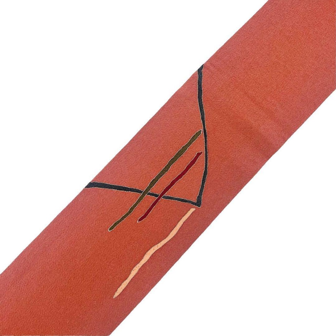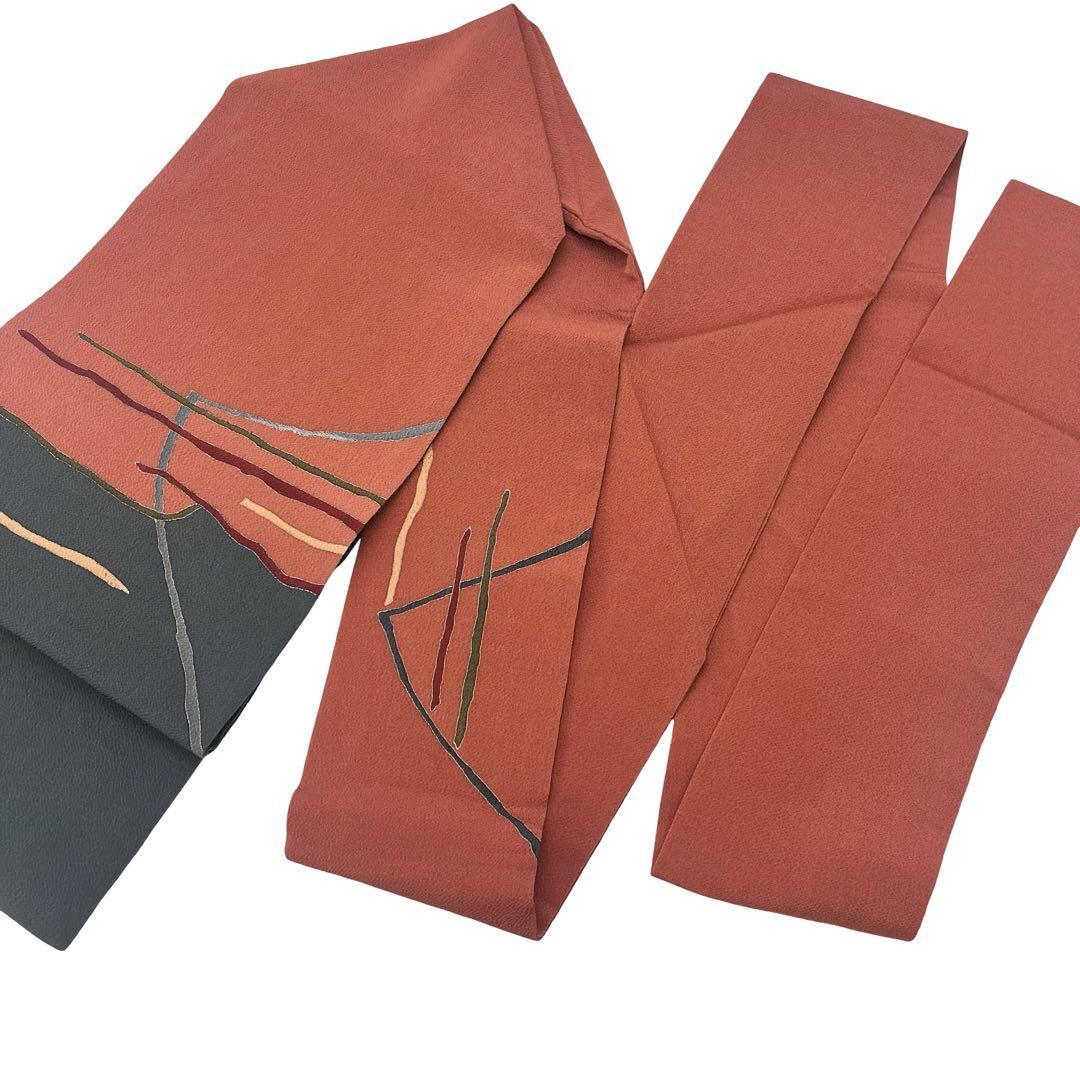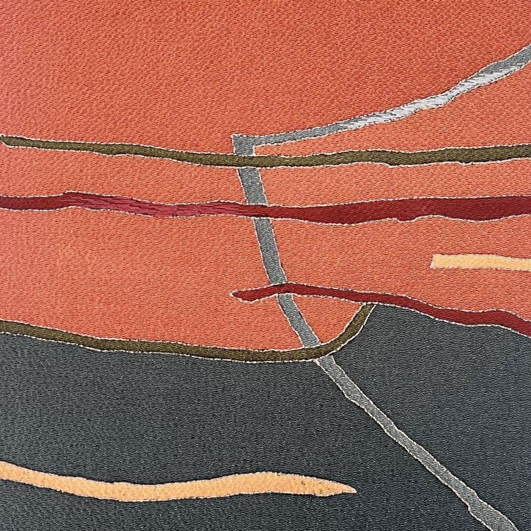 赭色ベースの縮緬地に染分けの色彩、一部刺繍を使った抽象模様の柄裄がデザインされた素敵なお品でございます。