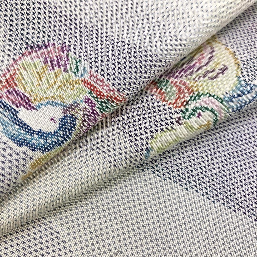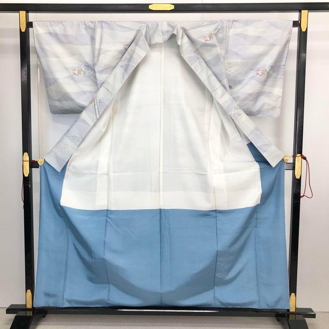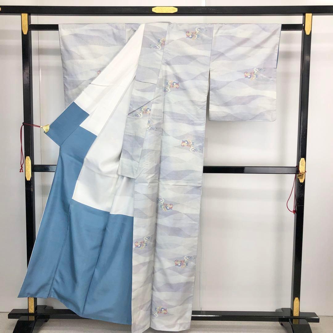 雪白色ベースの上品なお色味に波のような模様に鴛鴦の柄裄がデザインされた素敵なお品でございます。