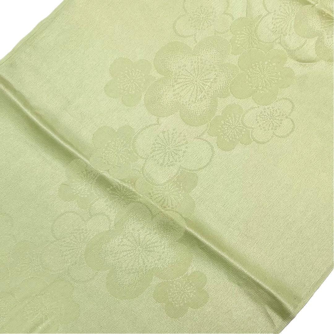 苗色のお色味に梅の花模様がデザインされた品のある素敵な柄裄のお品でございます。