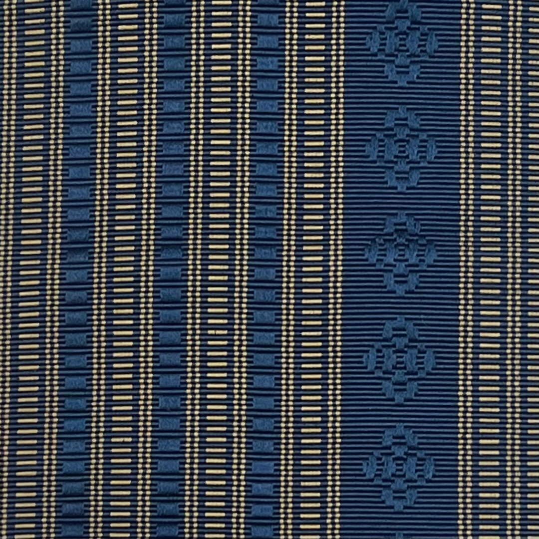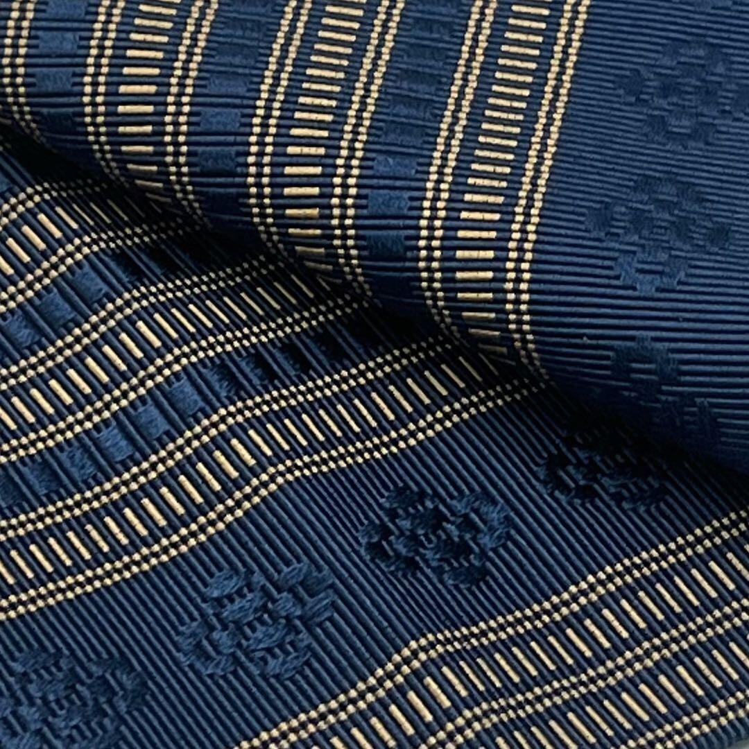 深藍色の落ち着きのあるお色味に縦縞織模様の柄裄がデザインされた素敵なお品でございます。