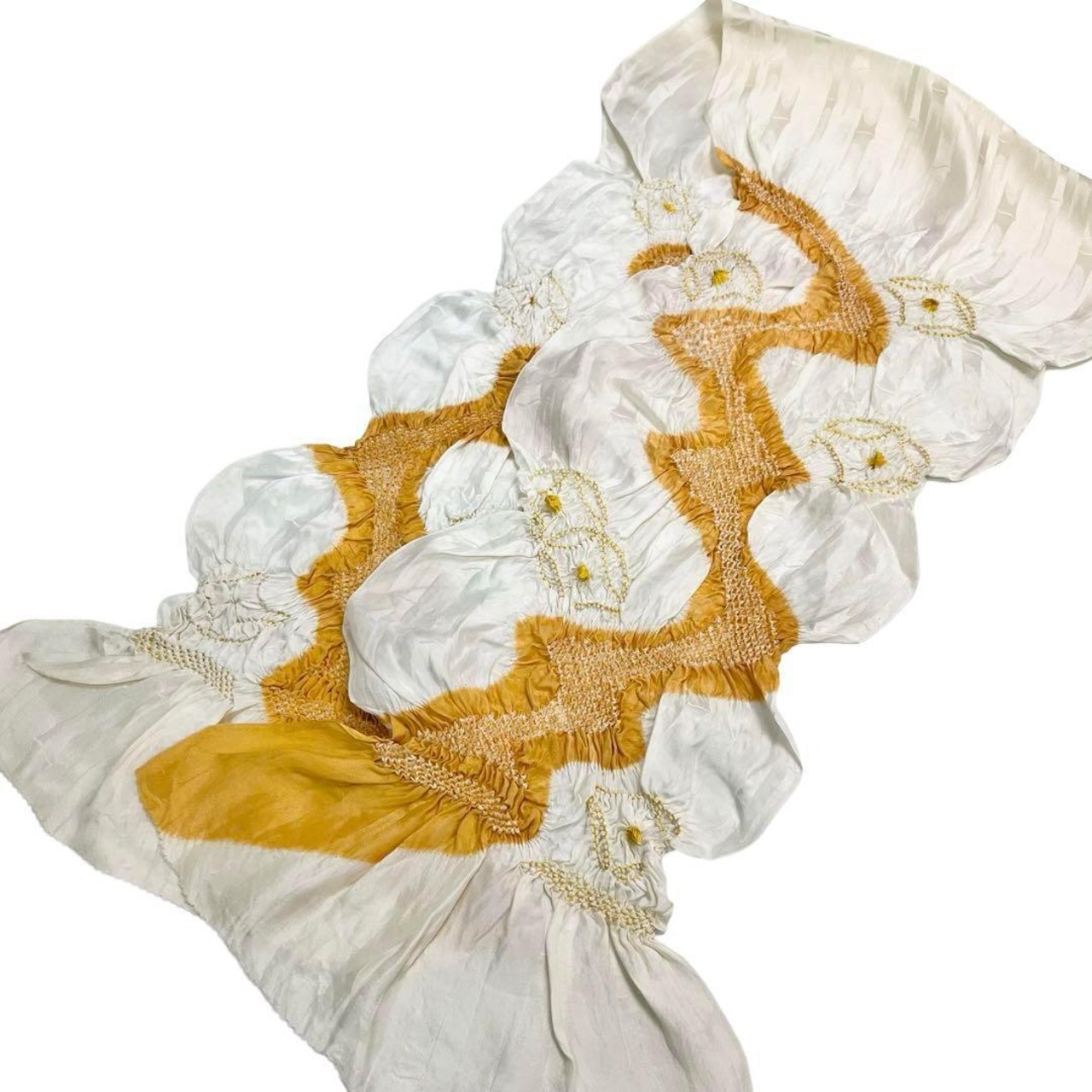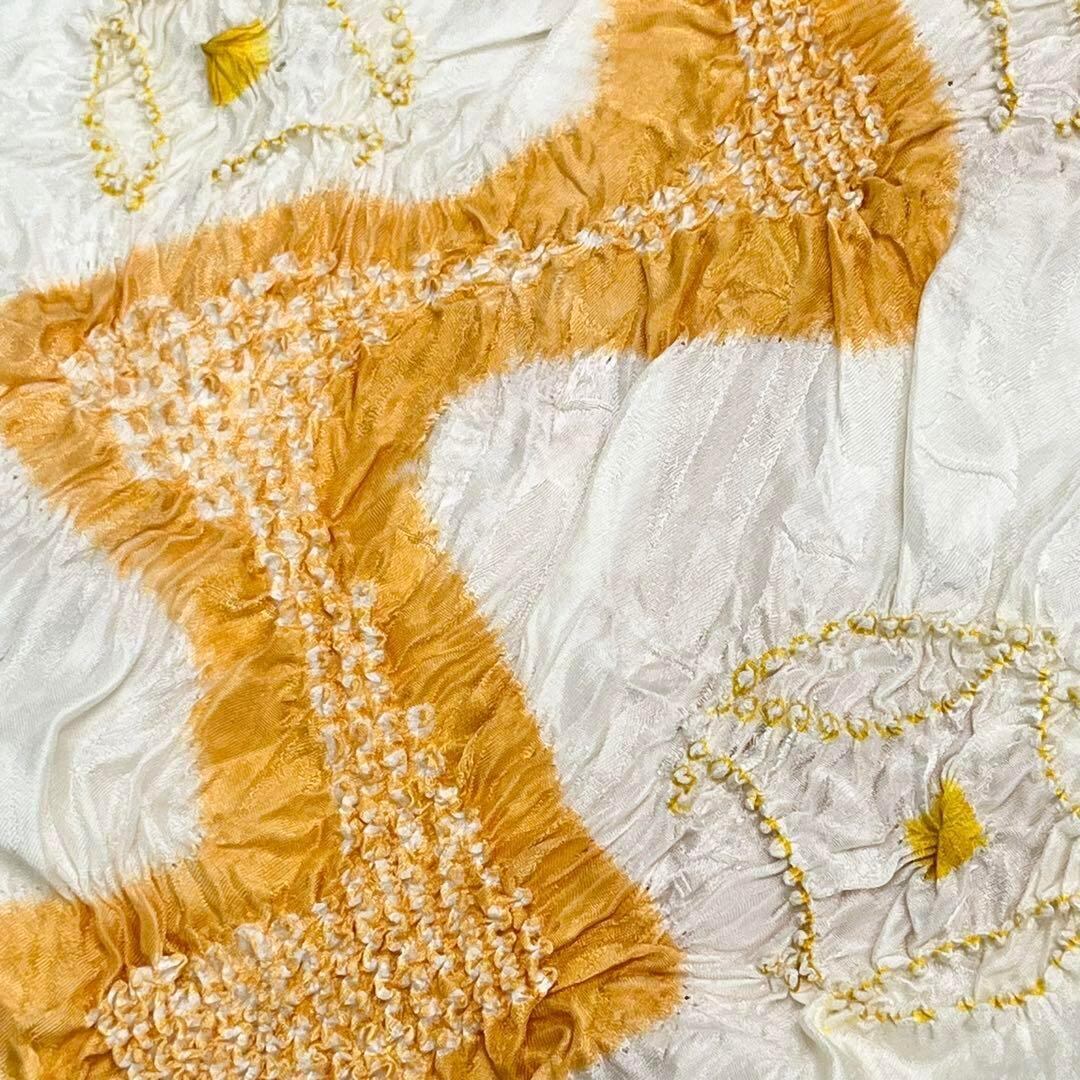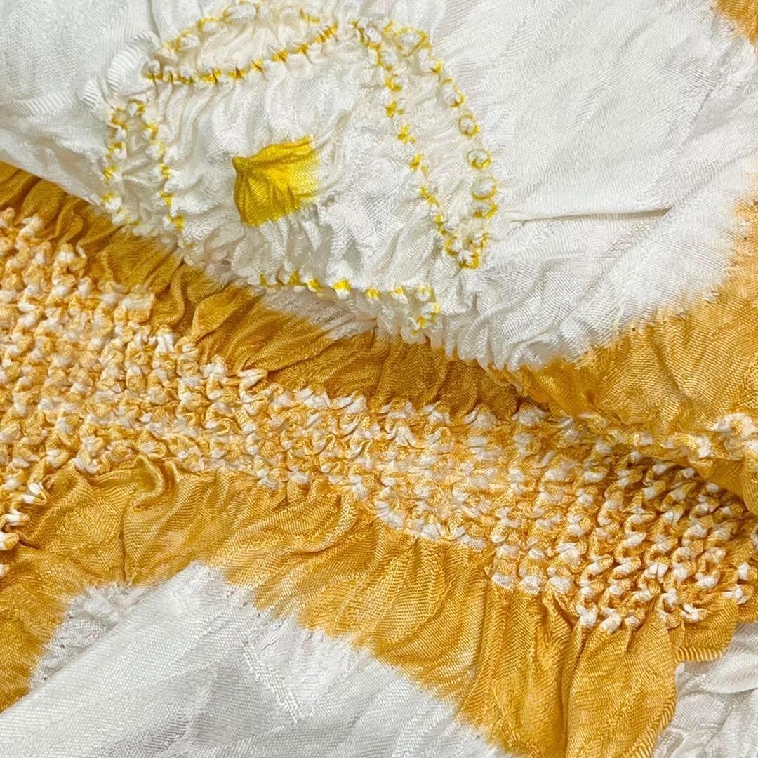乳白色のお色味に絞りで花模様がデザインされた品のある素敵な柄裄のお品でございます。