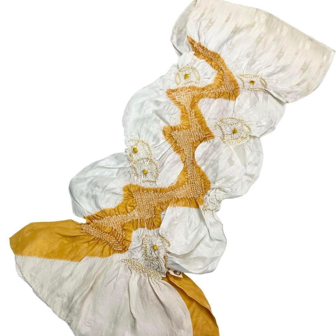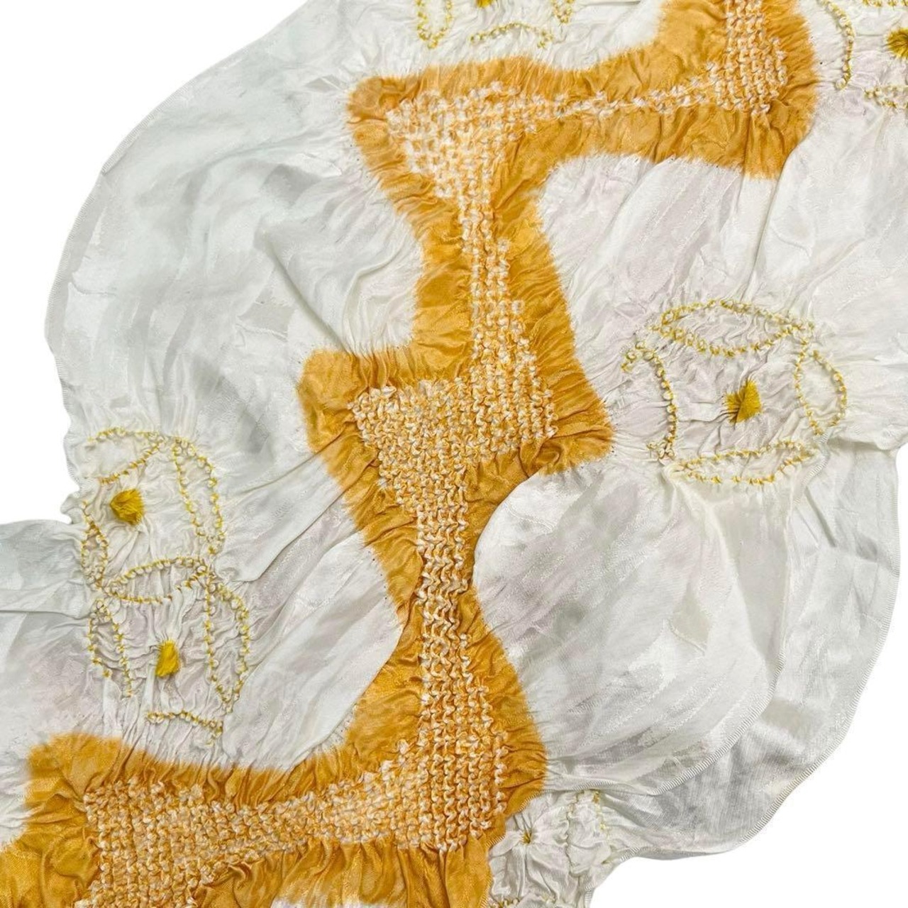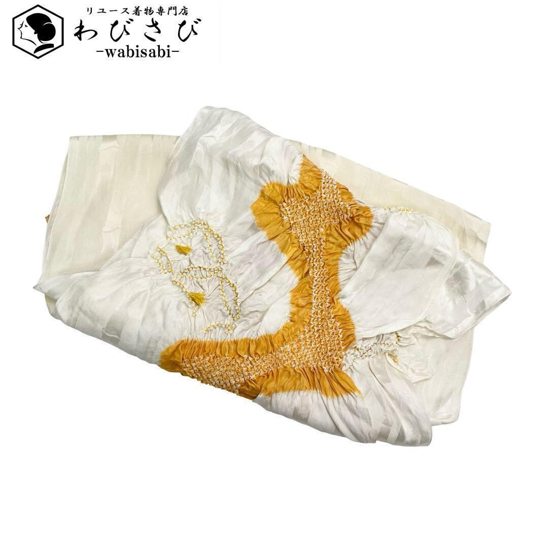 乳白色のお色味に絞りで花模様がデザインされた品のある素敵な柄裄のお品でございます。