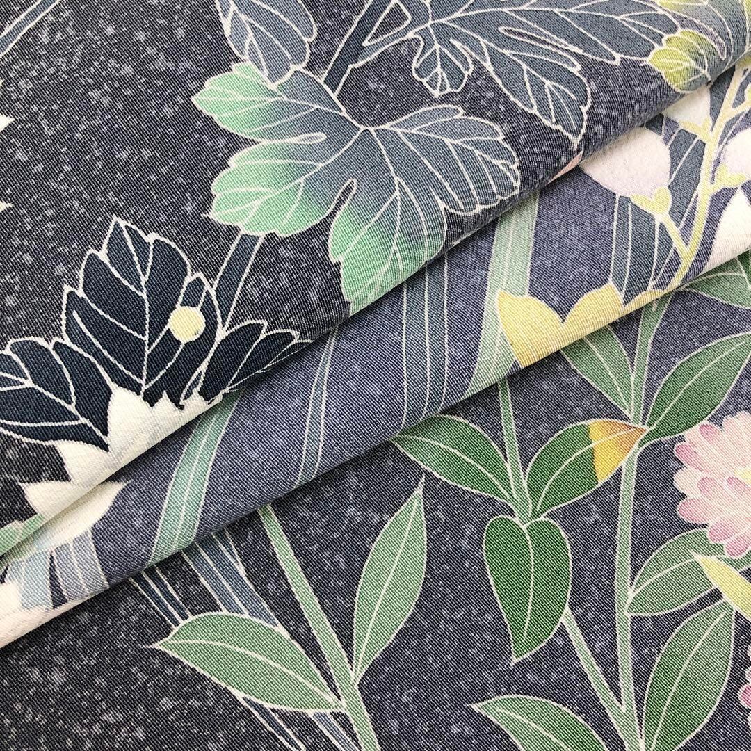 灰青色のお色味に叩き染、美しい友禅の花模様がデザインされた素敵な柄行のお品でございます。