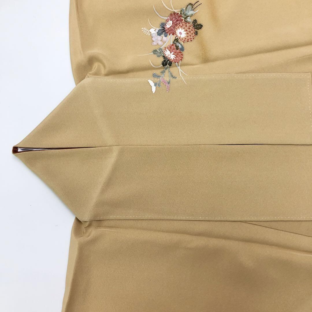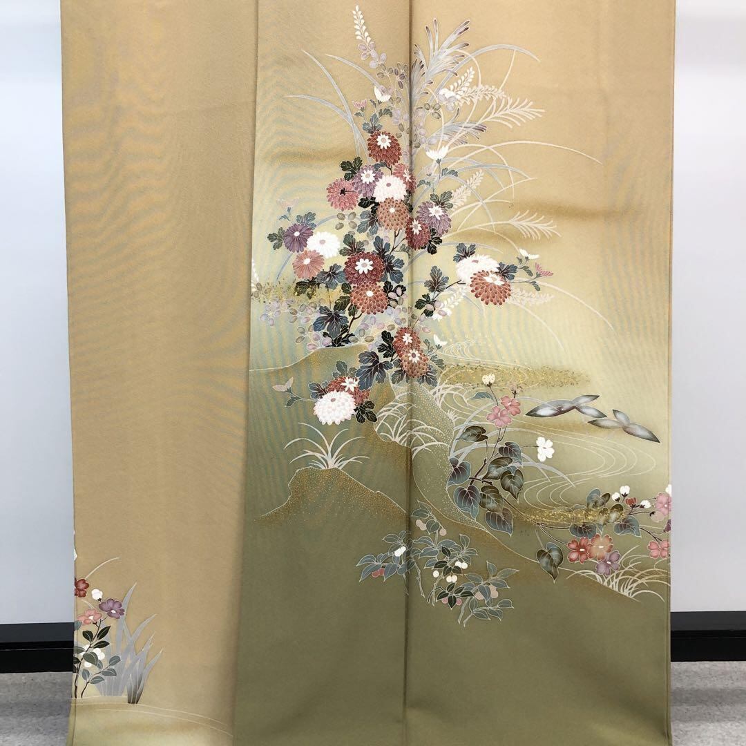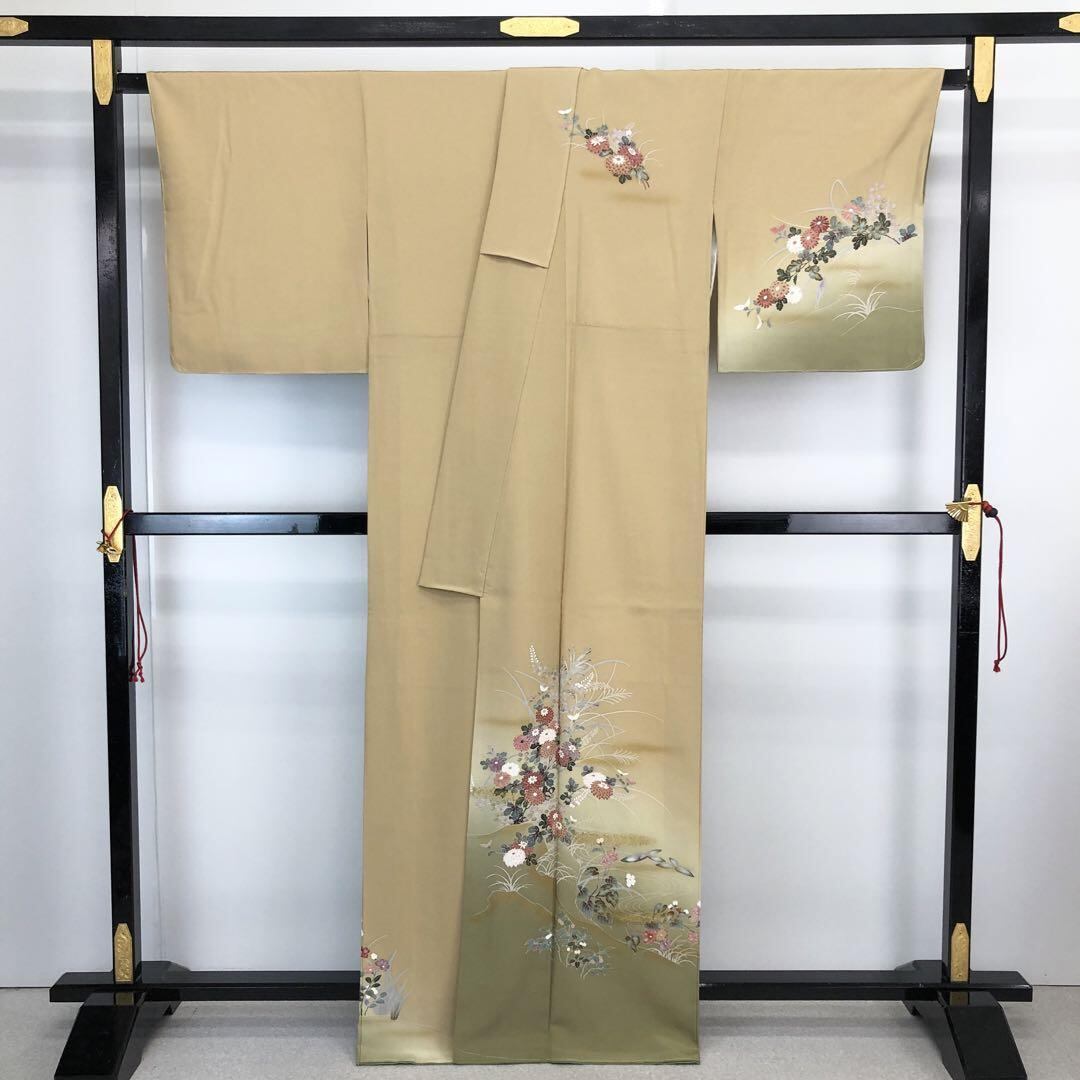訪問着 友禅 美しい花模様 暈し 麦藁色 金彩 縮緬 トールサイズ K-4364 着物 きもの kimono 和服 和装 中古 リサイクル着物 【送料無料】