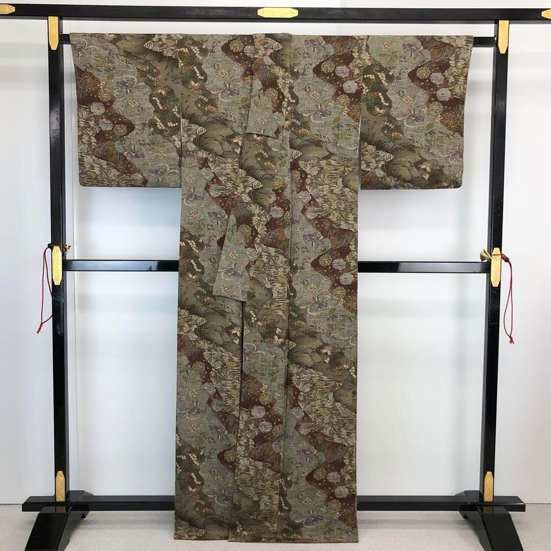 錆利休色ベースの落ち着きのある色彩の縮緬、鳥、蝶、花模様の柄裄がデザインされた素敵なお品でございます。