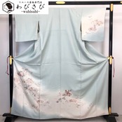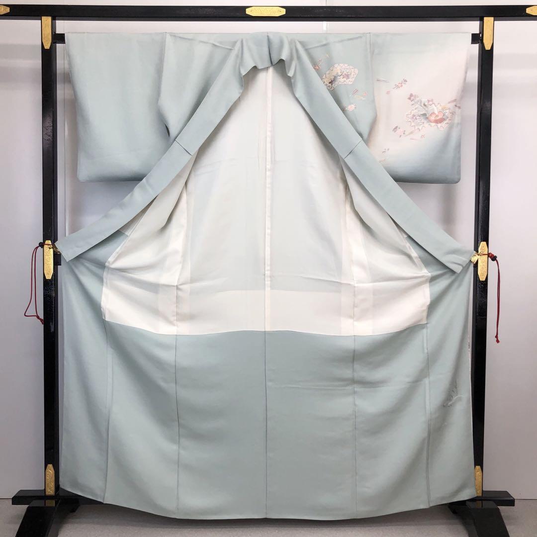 訪問着 総刺繍 地紙に美しい花模様 縮緬 青白磁色 トールサイズ K-4373 着物 きもの kimono 和服 和装 中古 リサイクル着物 【送料無料】