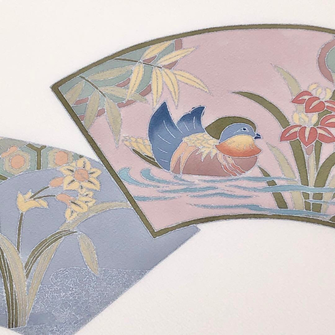 乳白色の品あるお色味の縮緬に地紙の中に水鳥、花模様の柄裄がデザインされた素敵なお品でございます。