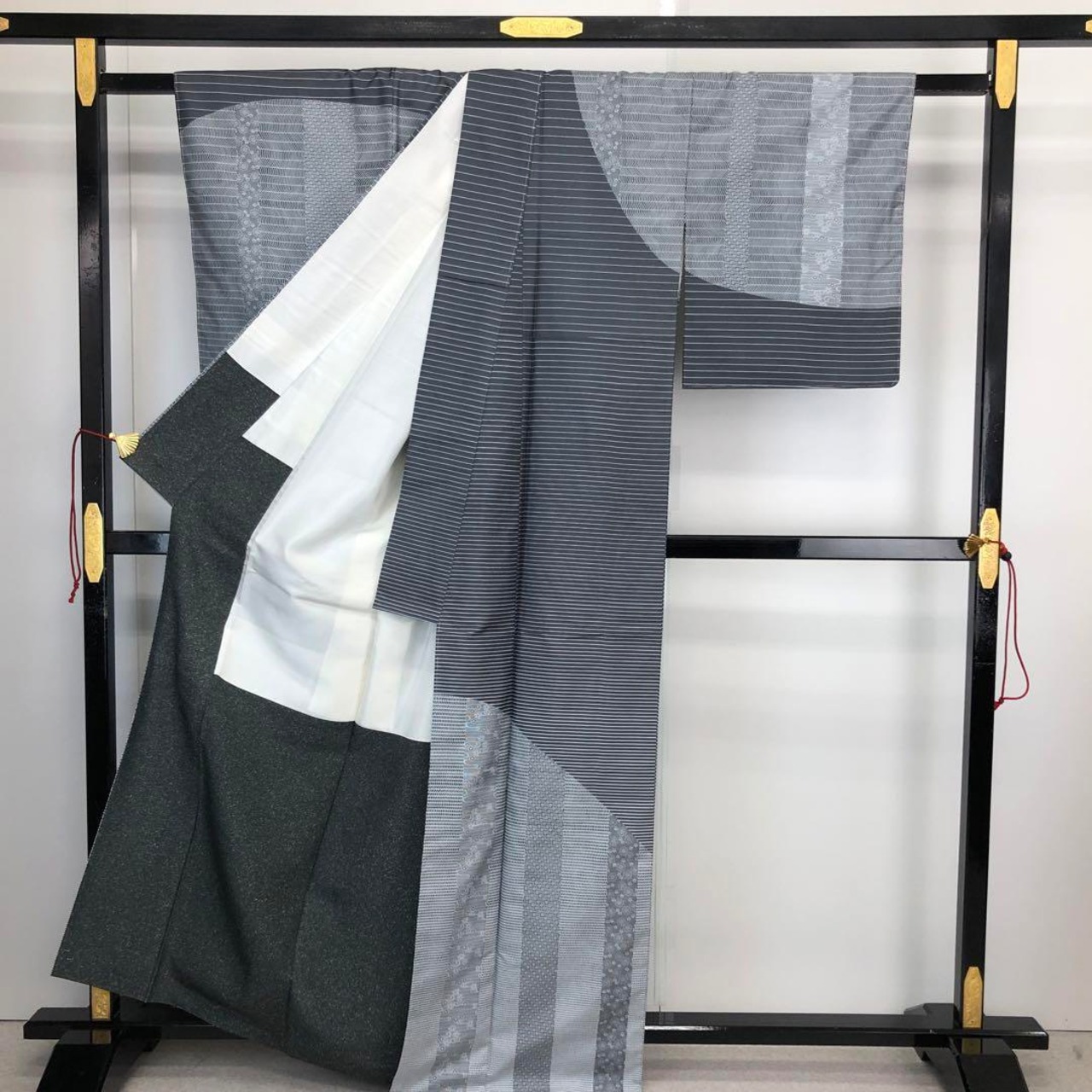 モノトーンのモダンなお色味ベースの流水、小花模様、縞模様などの柄裄がデザインされた雰囲気の良い素敵なお品でございます。