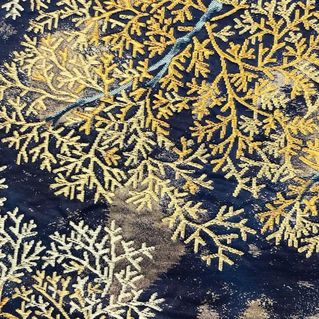 韓藍色の落ち着きのある青味に暈しの色彩、金色の美しい枝木模様の柄裄がデザインされた素敵なお品でございます。