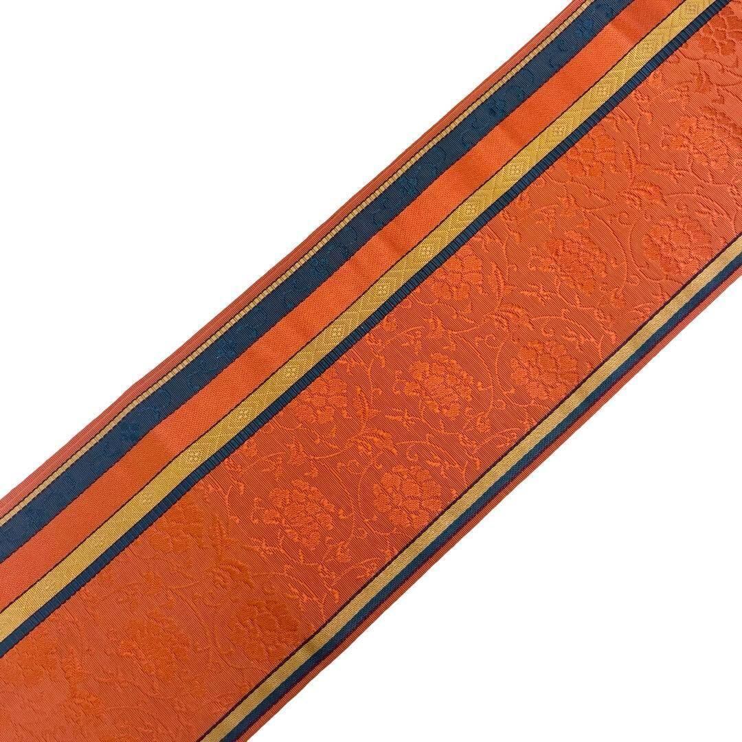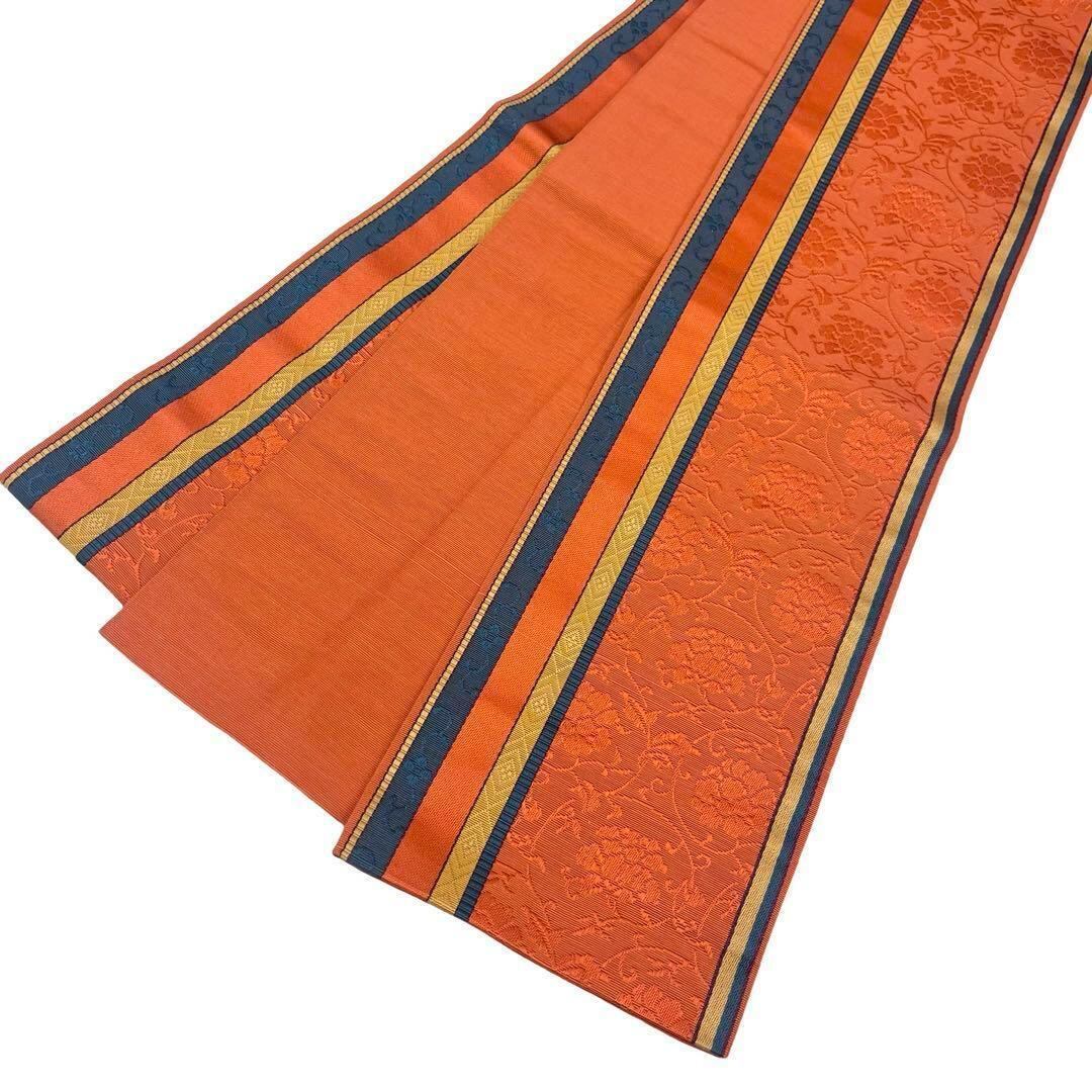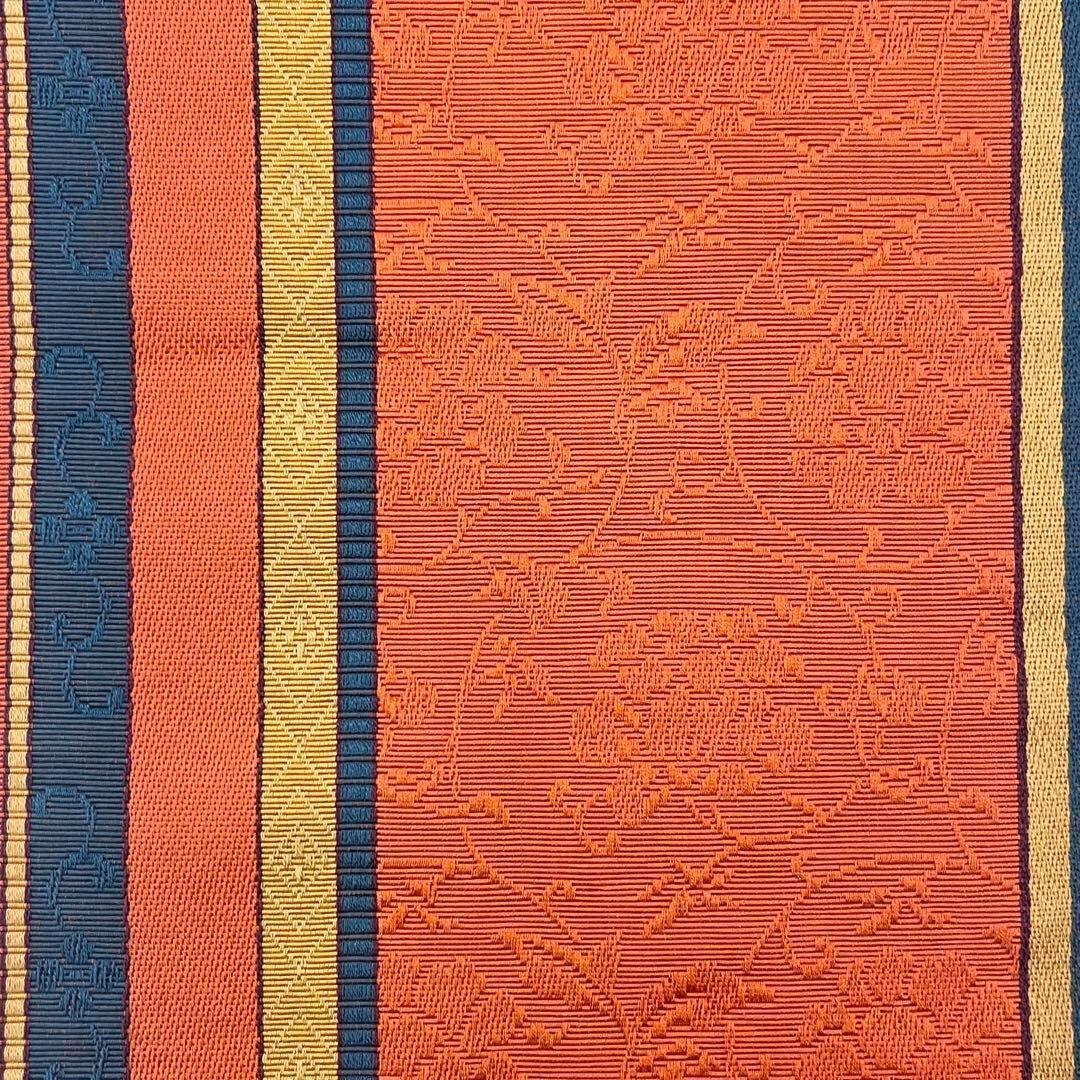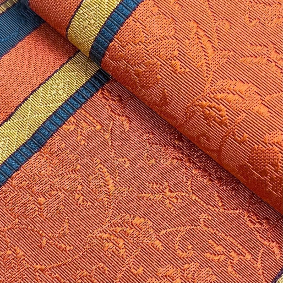赤橙色ベースのお色味に縦縞に花唐草模様がデザインがされた素敵なお品でございます。