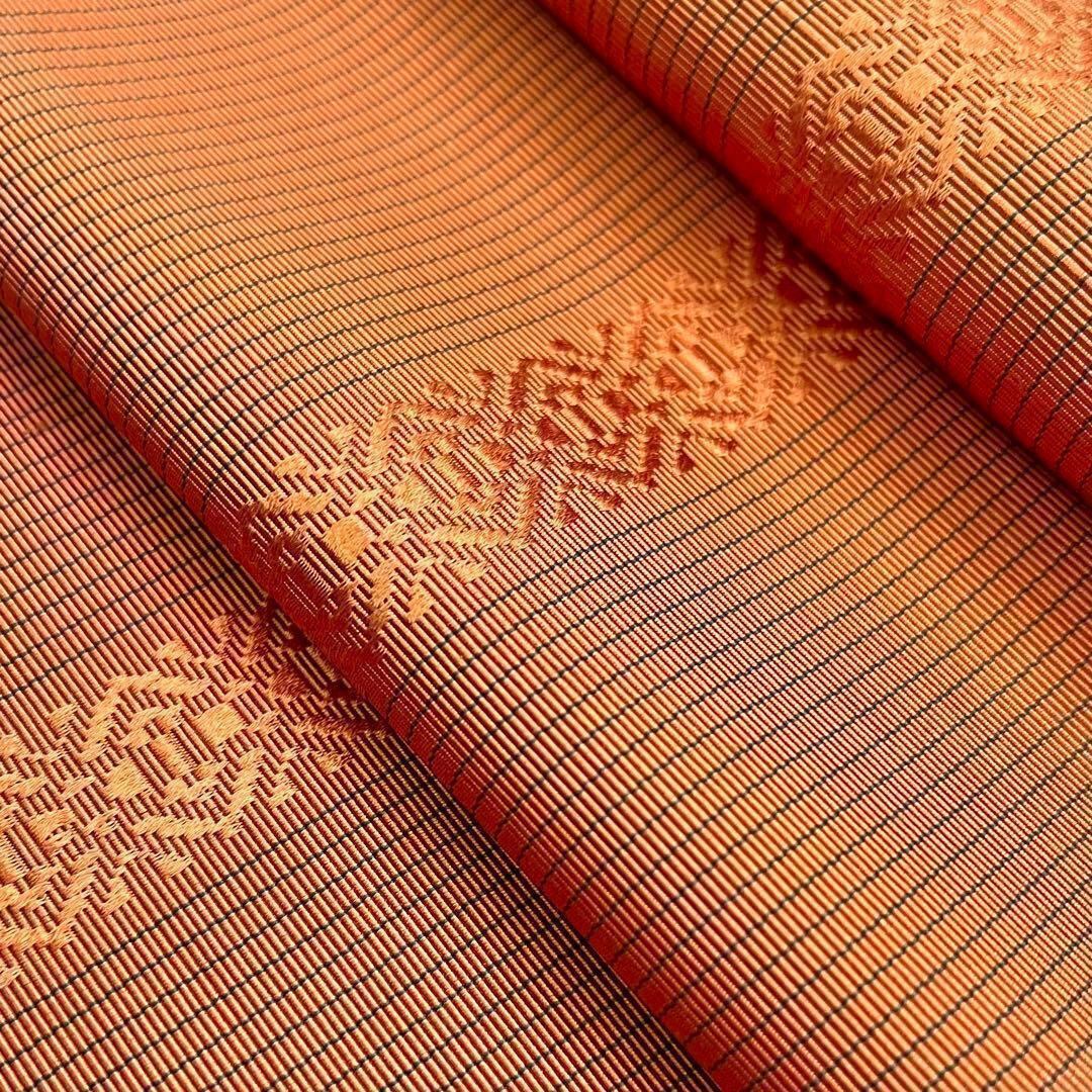 赤錆色の落ち着きのあるお色味に縦縞に献上柄がデザインされた素敵な柄裄のお品でございます。