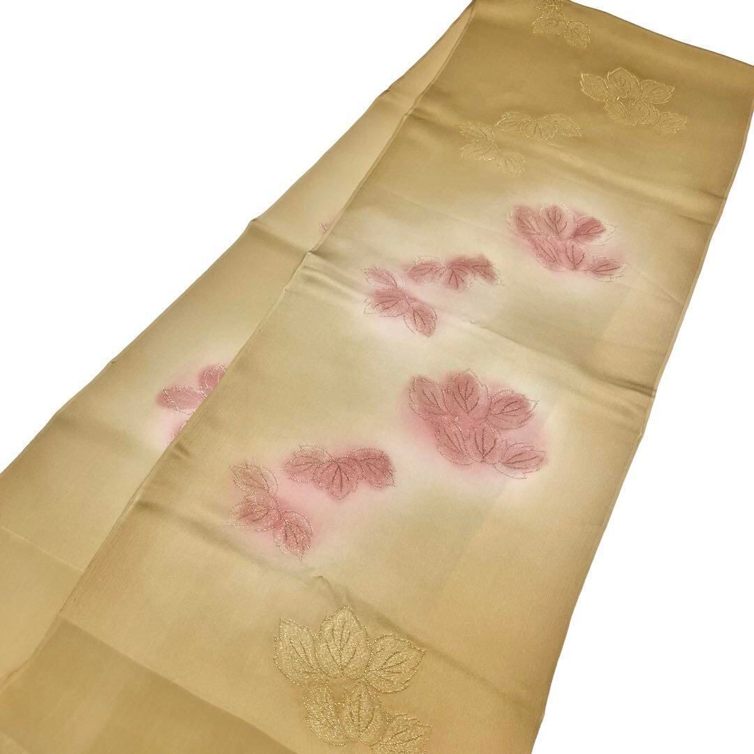 和装小物 帯揚げ 正絹 暈し 花模様 金糸 薄茶色 C-5506 着物 きもの kimono 和服 和装 中古 リサイクル着物 【送料無料】