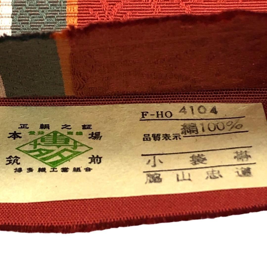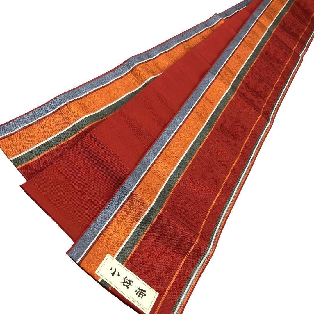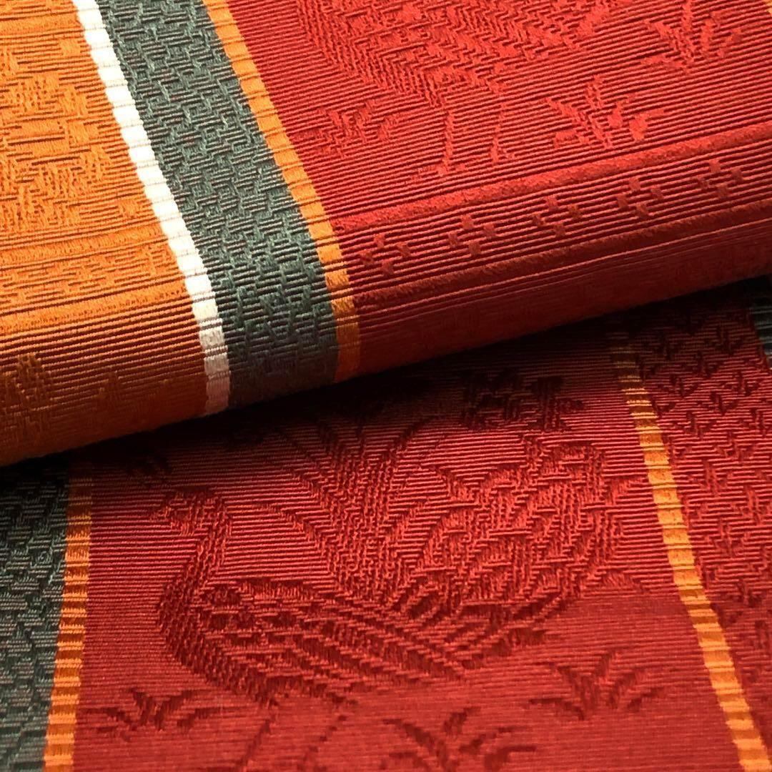 紅絹色ベースのお色味に縦縞に孔雀に花模様の柄裄がデザインされた素敵なお品でございます。
