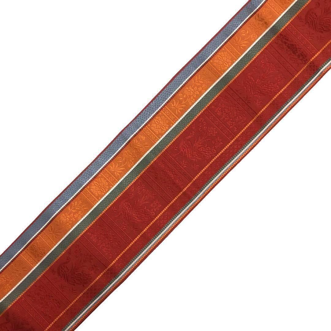 半幅帯 本場筑前博多織 証紙付 孔雀に花模様 紅絹色 D-2025 着物 きもの kimono 和服 和装 中古 リサイクル着物 【送料無料】