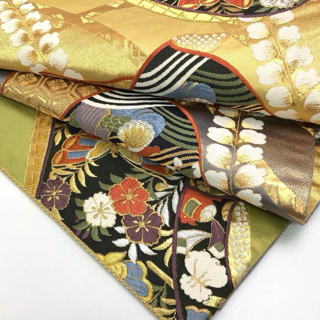 三色染と題された色彩美しい熨斗に鳥、蝶、花柄、波模様などの華やかな柄裄がデザインされた素敵なお品でございます。