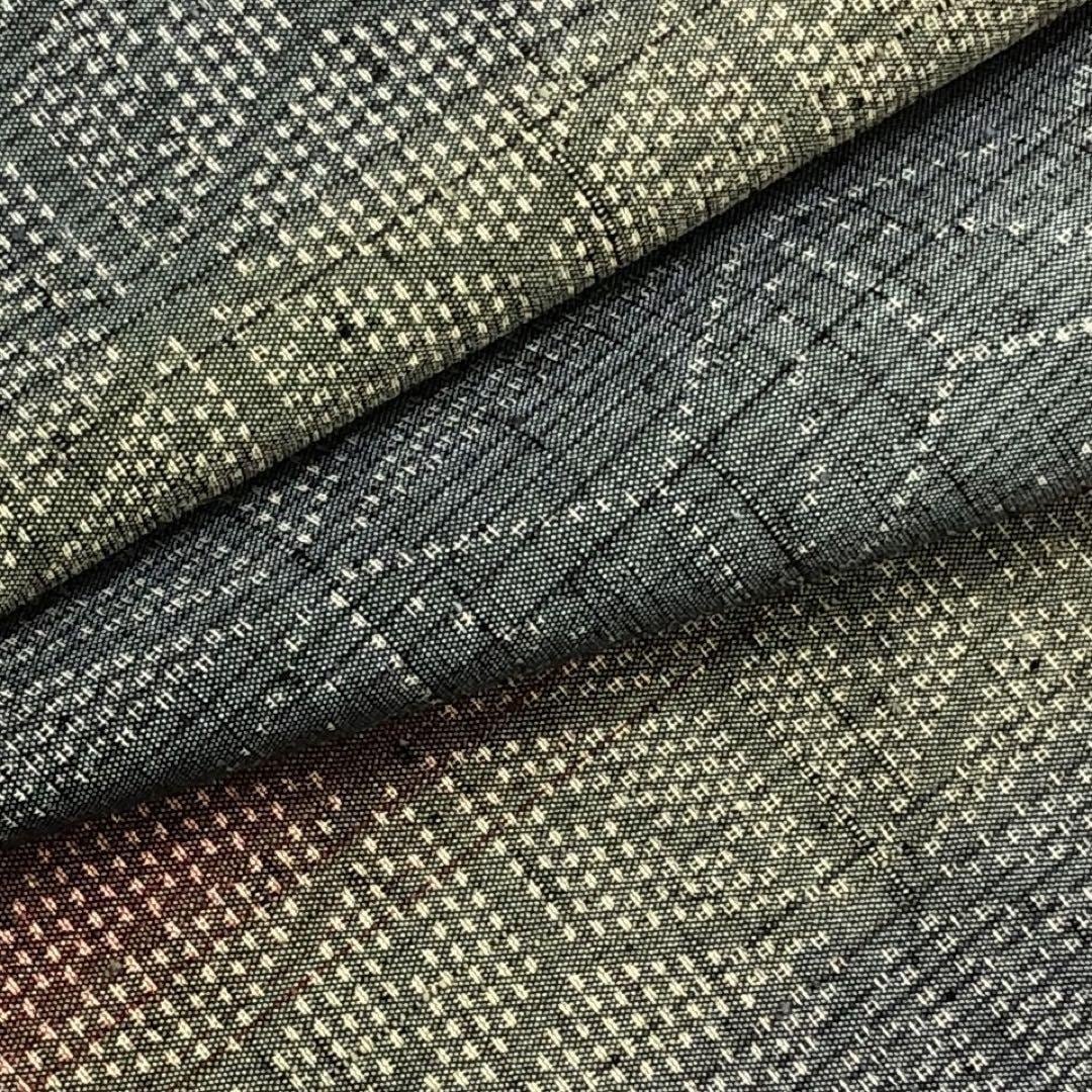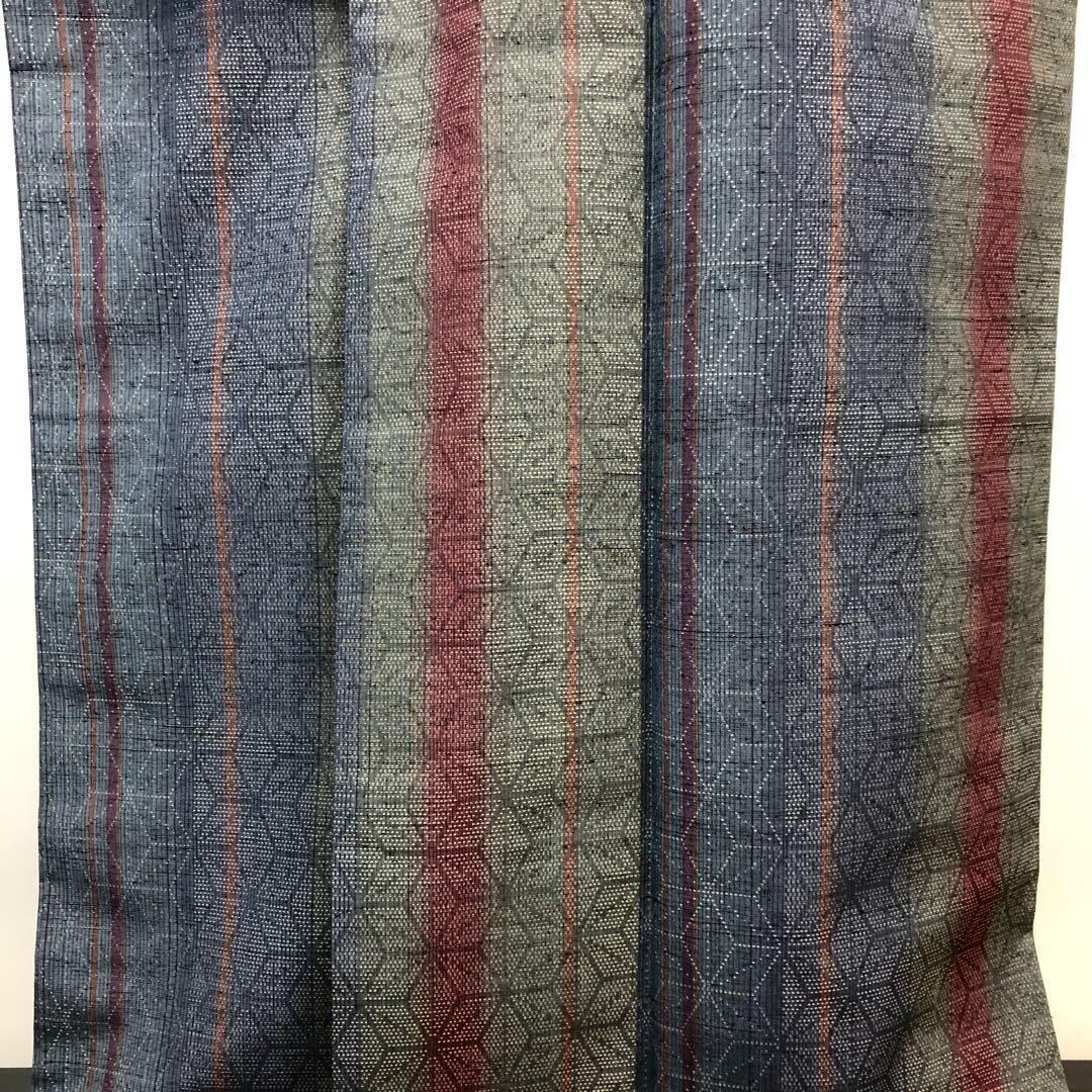 灰青色ベースのグラデーション、麻の葉や縦縞模様の柄裄がデザインされた雰囲気の良い素敵なお品でございます。