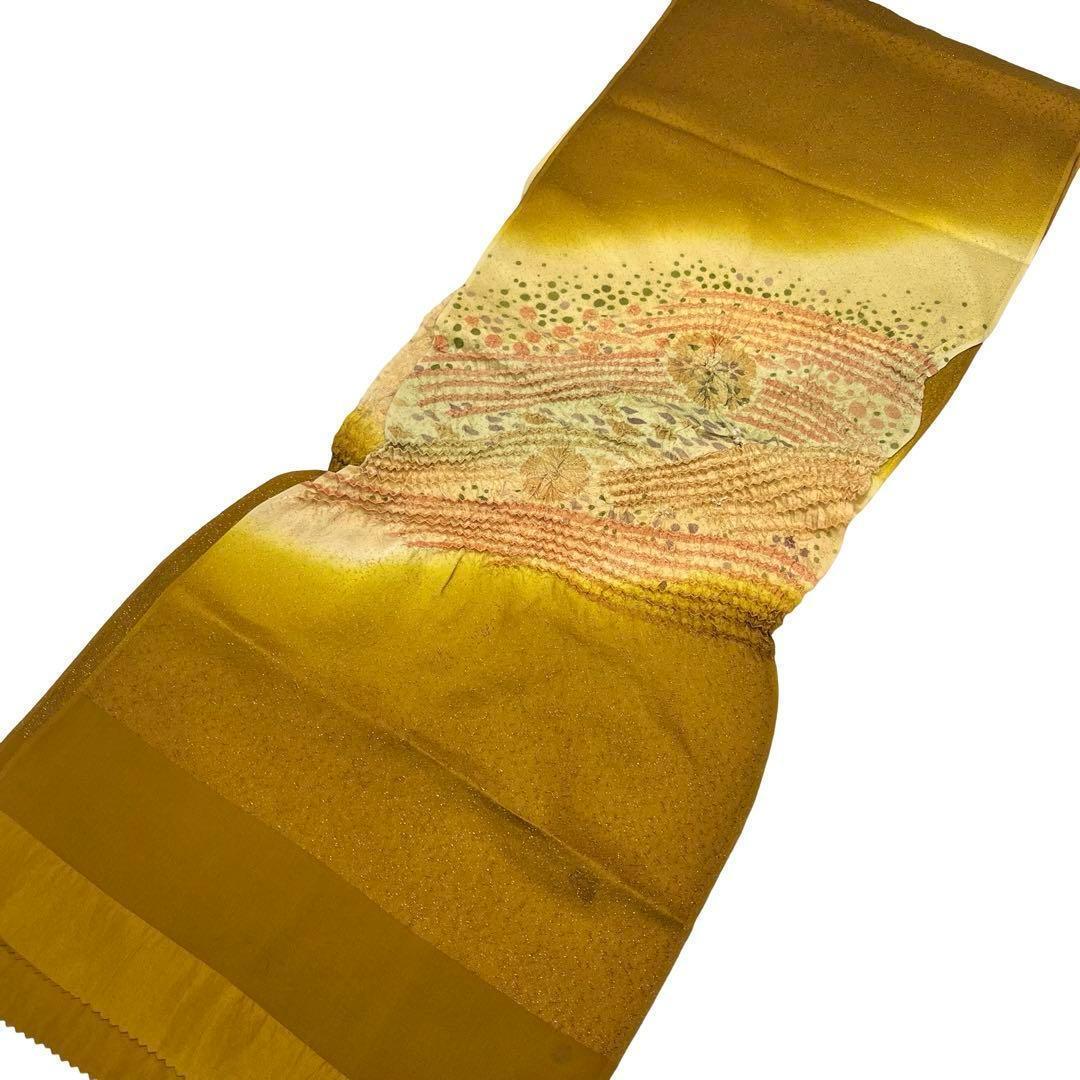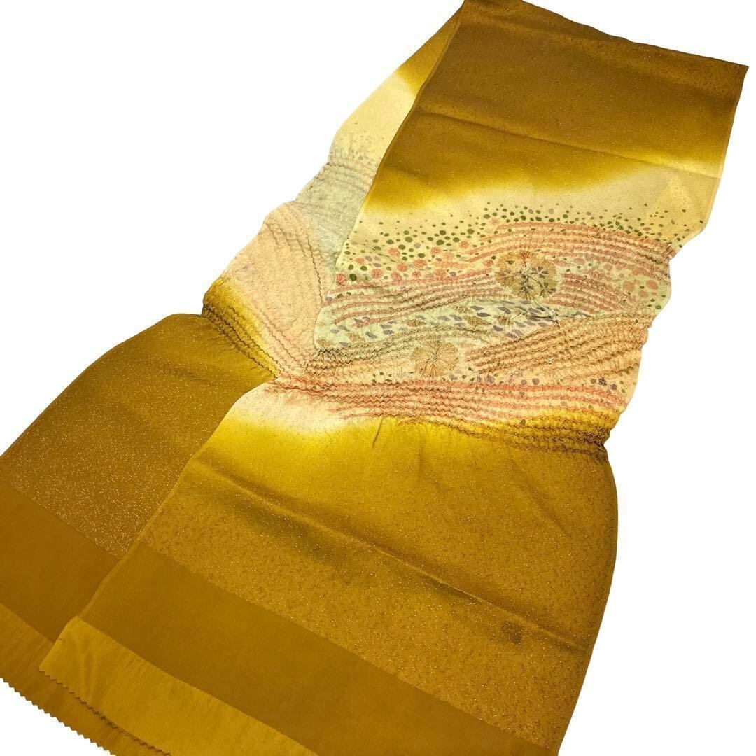 黄橡色のお色味に暈しや絞り、花模様の柄裄がデザインされた品のある素敵な柄裄のお品でございます。