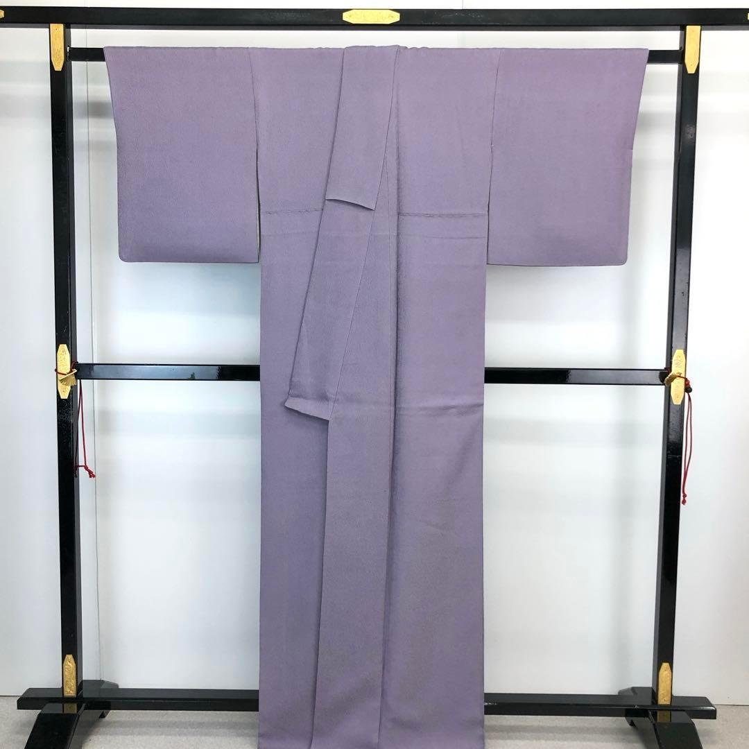 藤紫色のお色味の縮緬に紗綾形の地模様の柄裄がデザインされた京草木染の素敵なお品でございます。