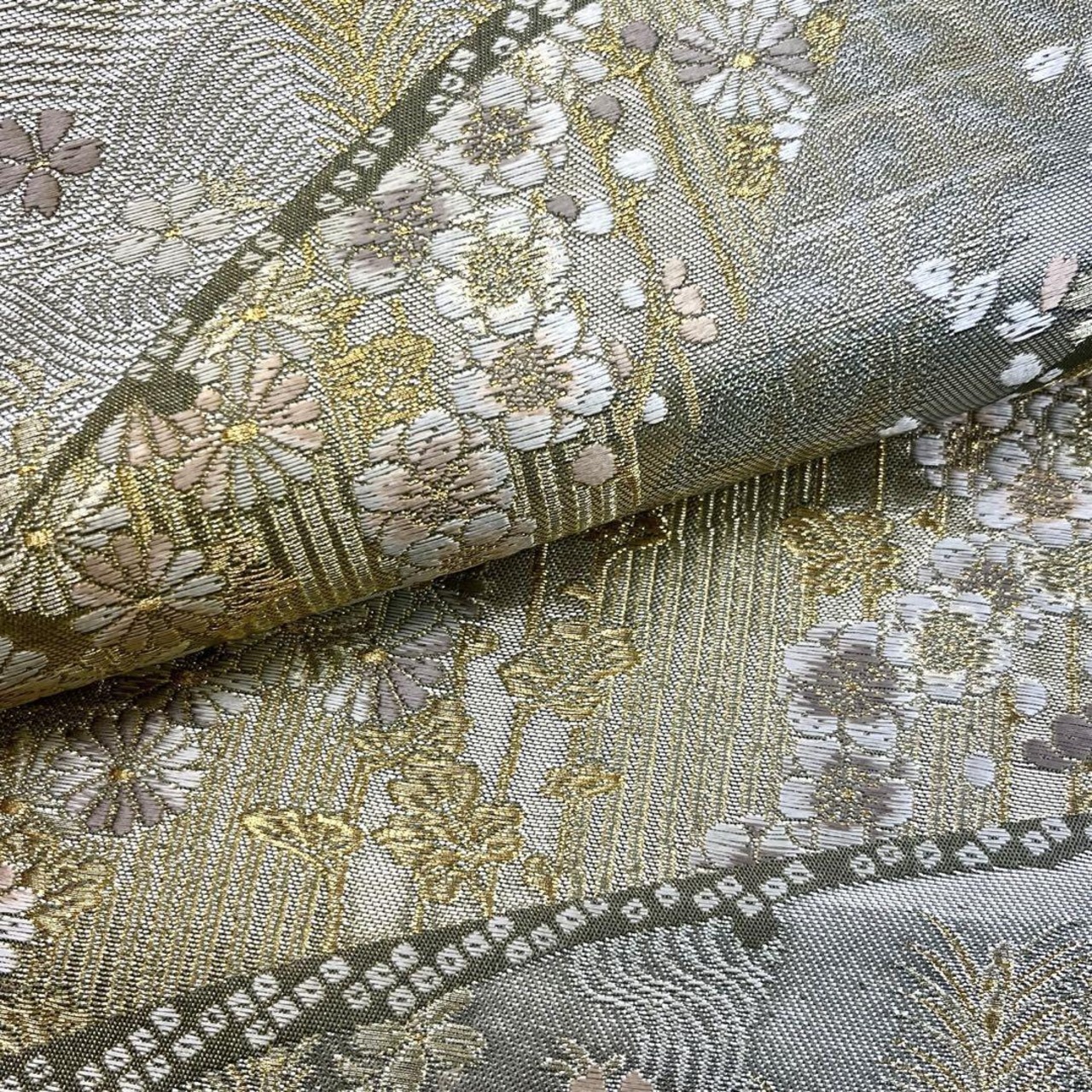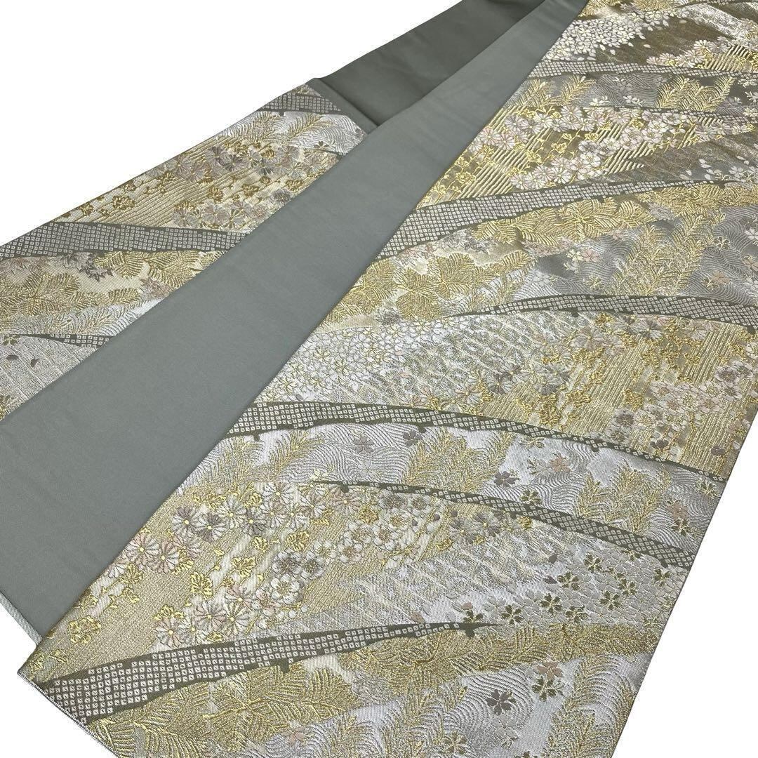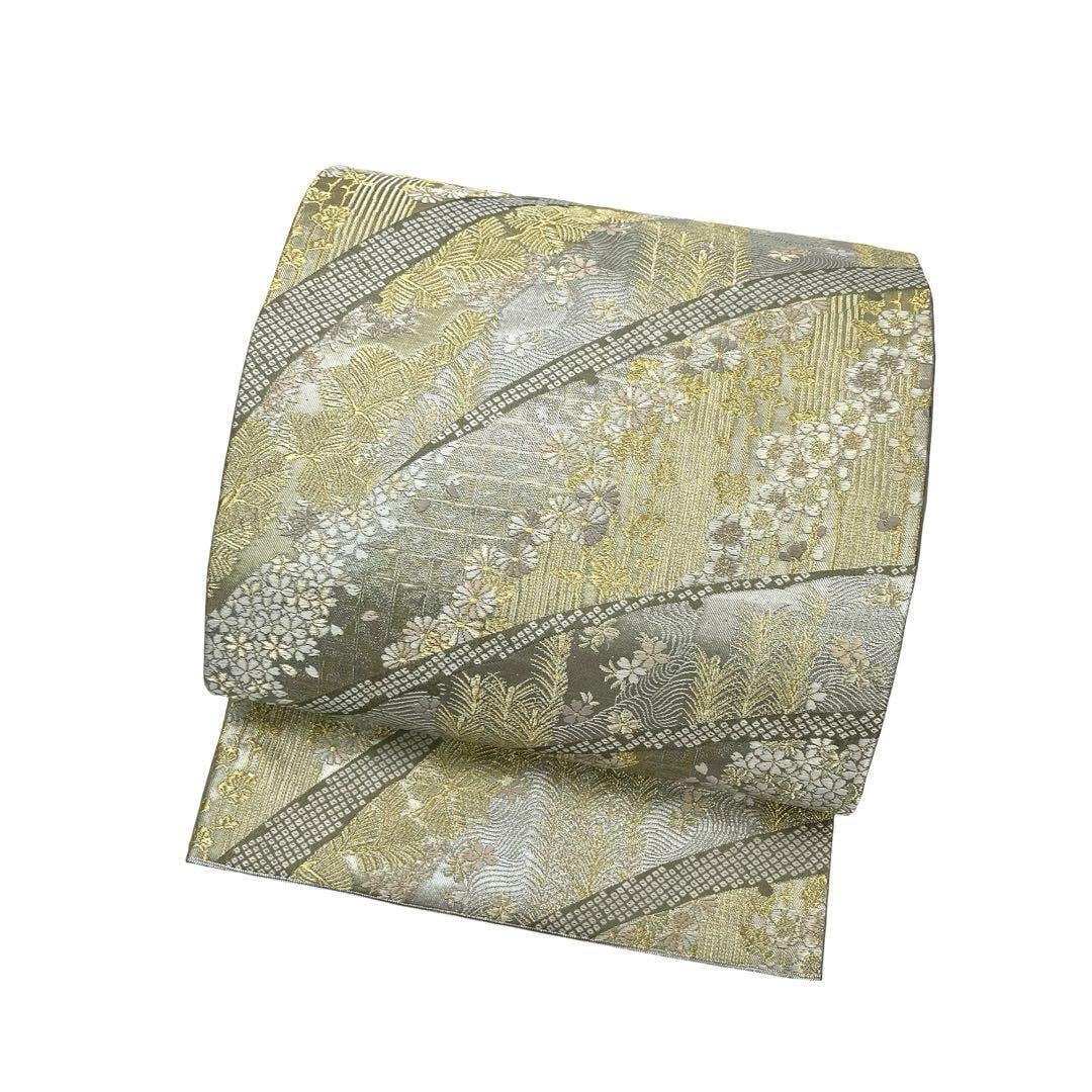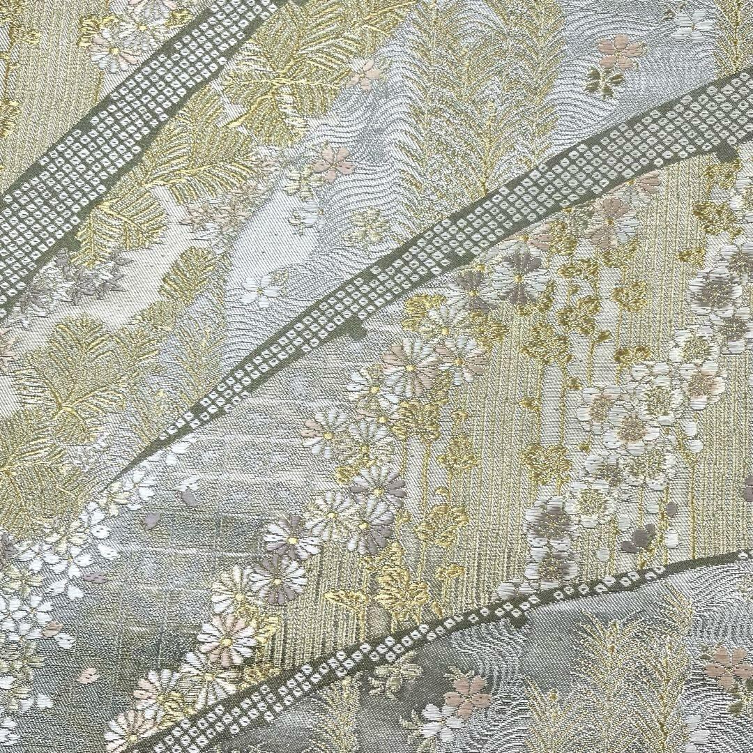 薄灰緑色ベースのお色味に桜、松、菊などの煌びやかな花模様の柄裄がデザインされた素敵なお品でございます。