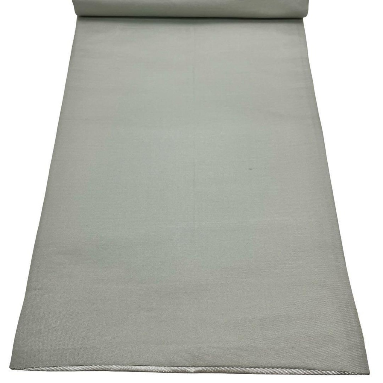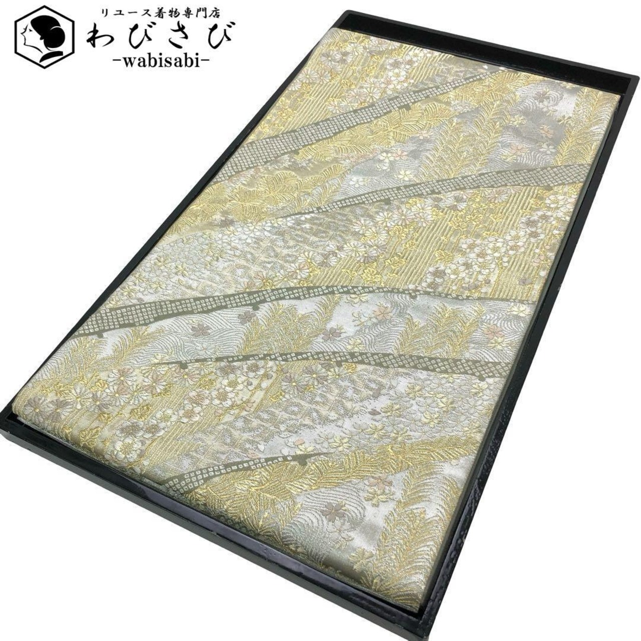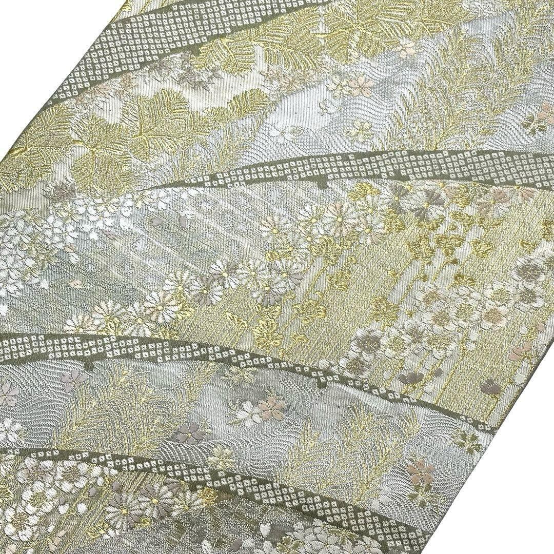 薄灰緑色ベースのお色味に桜、松、菊などの煌びやかな花模様の柄裄がデザインされた素敵なお品でございます。