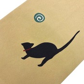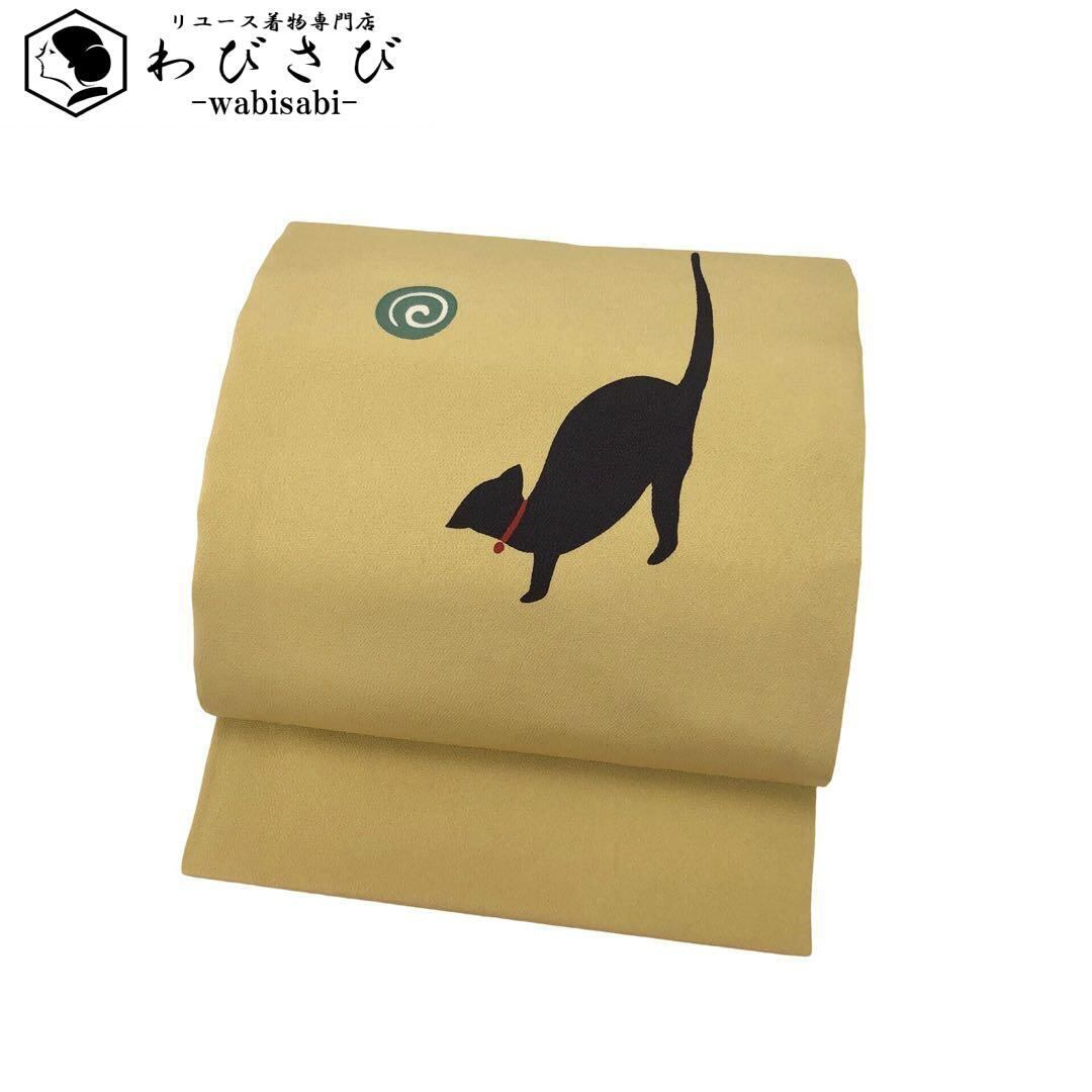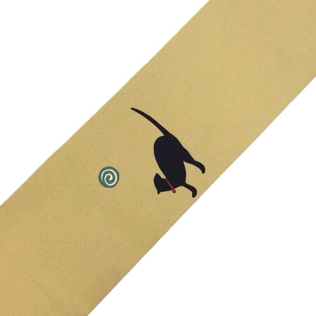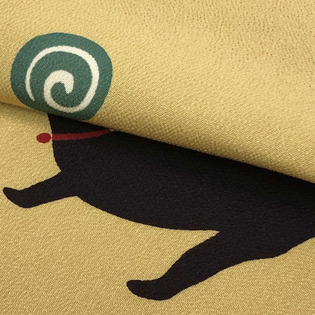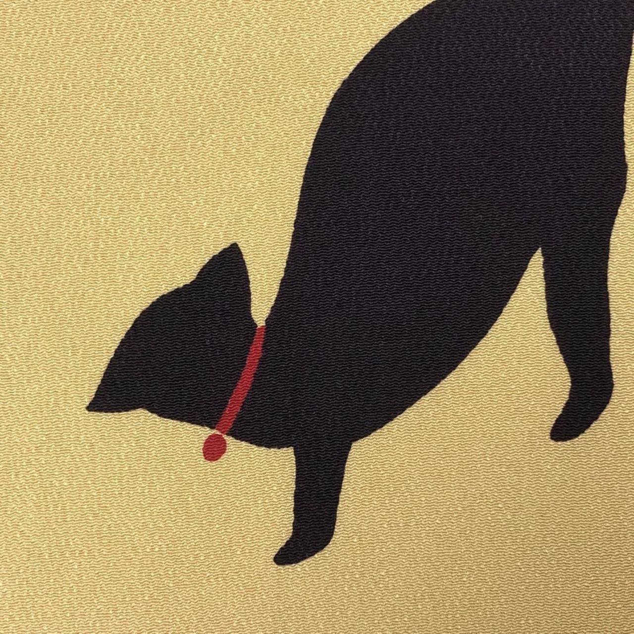 楊梅色のお色味の縮緬に黒猫にぐるぐるの尻尾がピンとなった可愛らしい柄裄がデザインされた素敵なお品でございます。